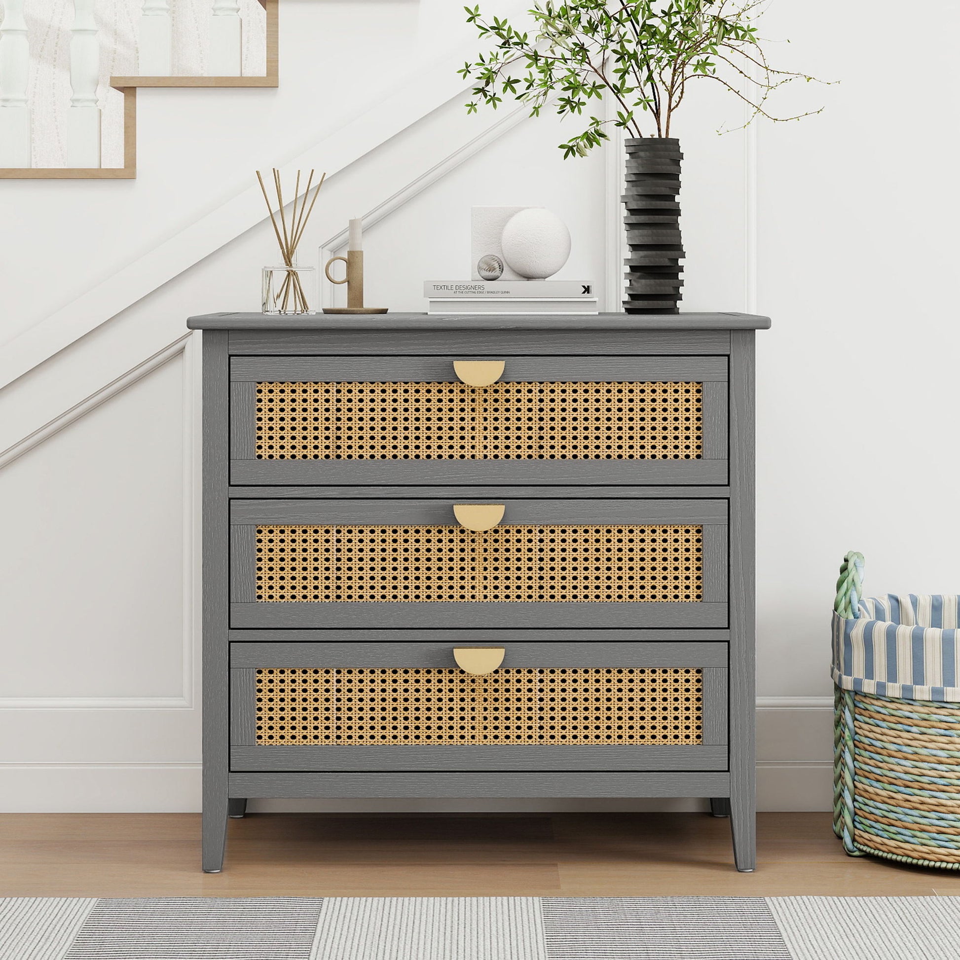 3 Drawer Cabinet Natural Rattan Suitable For Bedroom - Gray