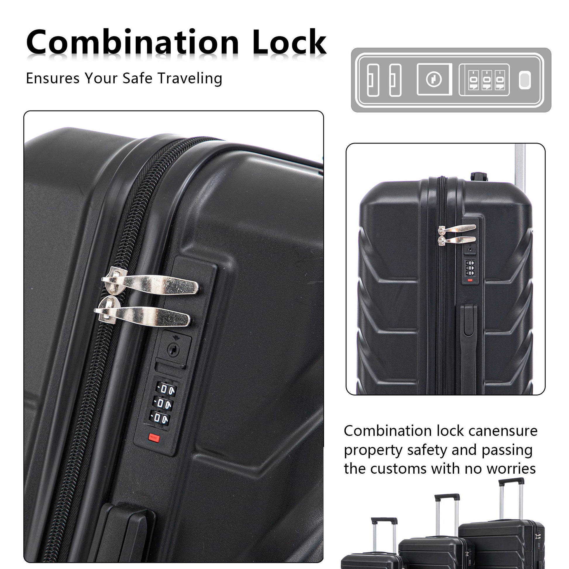 Set 3 Pieces 20" / 24" / 28" Abs Spinner Wheel Luggage, Matching Color, With Combination Lock - Black