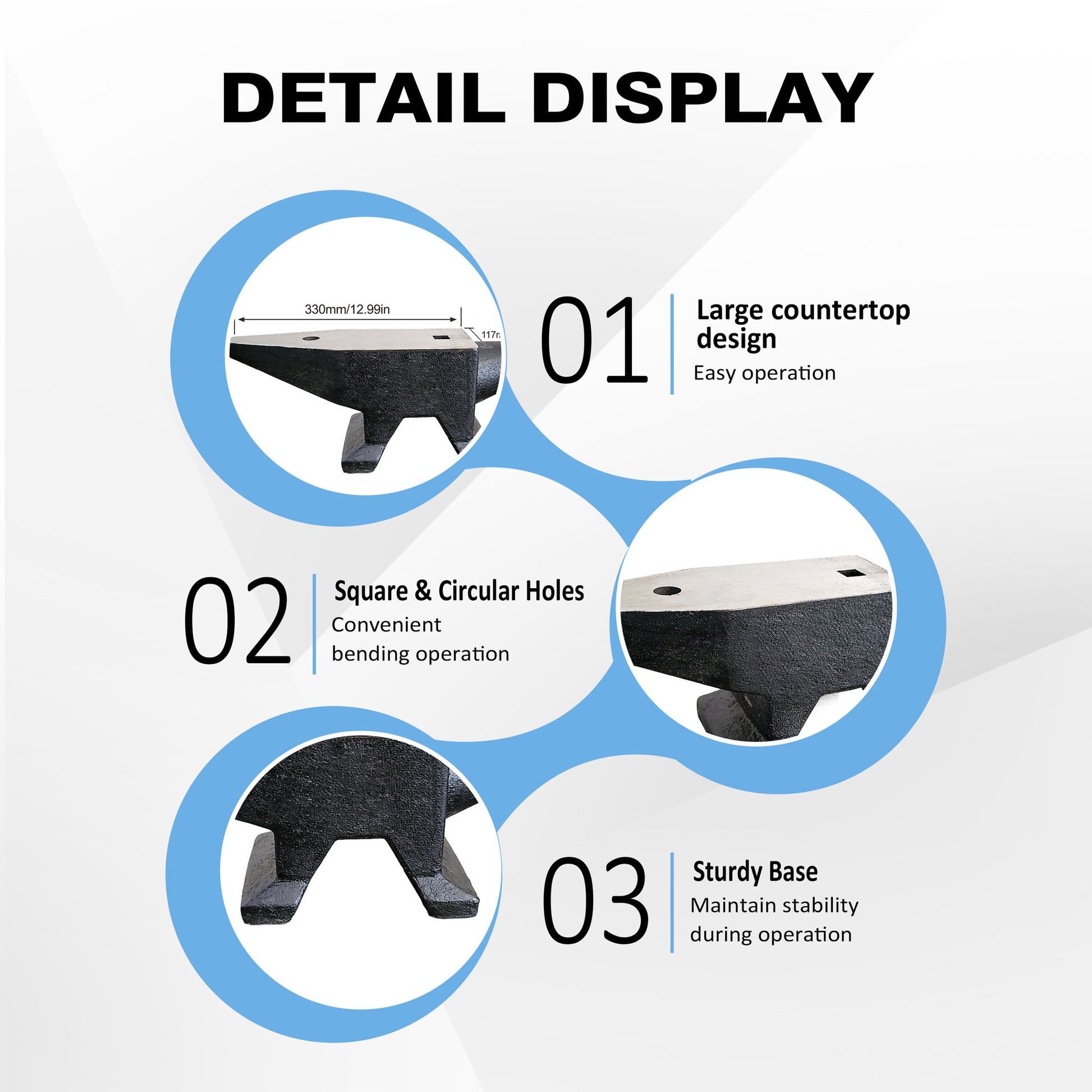 • Surface Treatment: The anvil has a completely polished surface area with excellent quenching treatment, achieving a hardness of up to HRC55, along with corrosion and rust resistance.