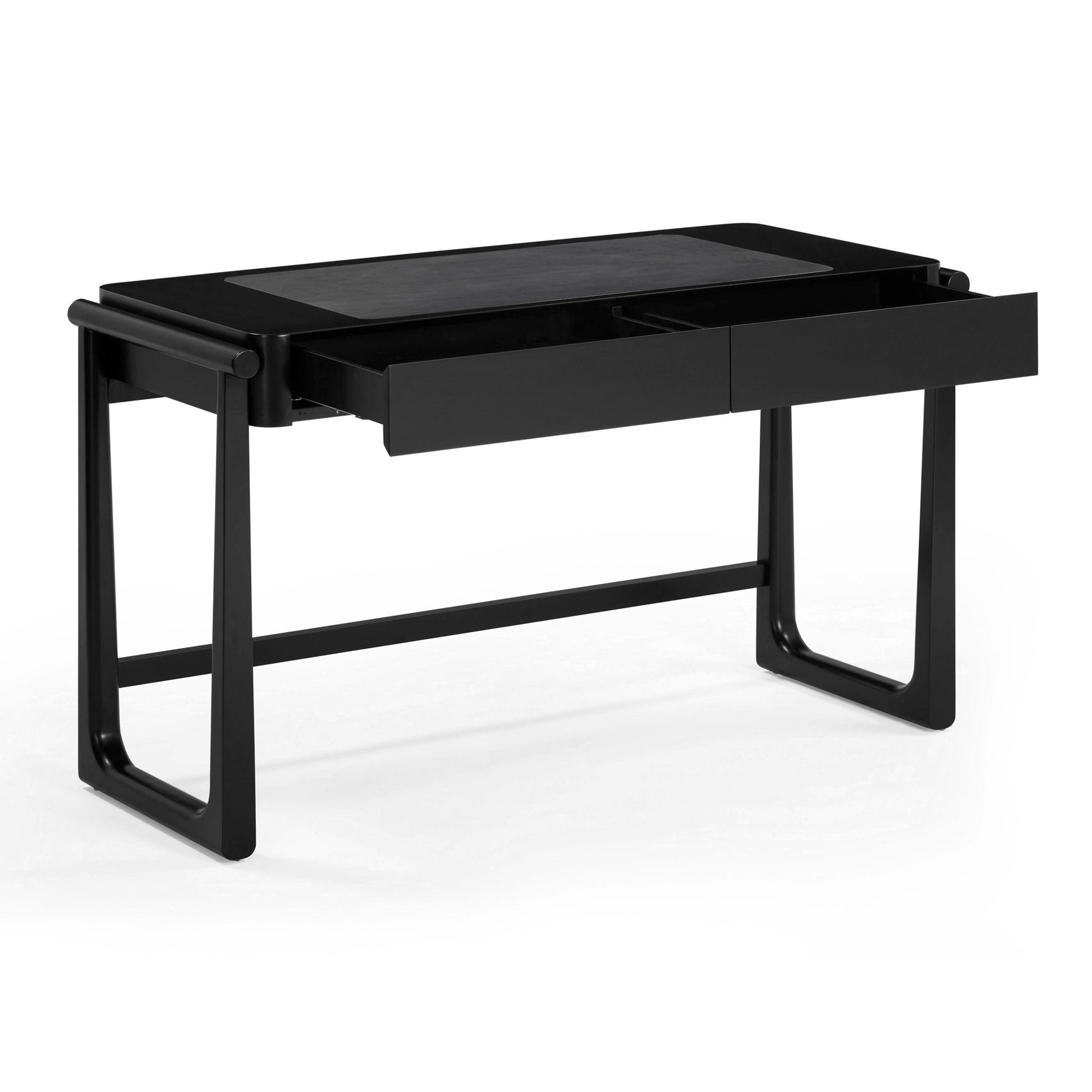 The Alfalfa Desk brings chic utility with two smooth-glide drawers and a padded work surface wrapped in ultra-cleanable, yacht-grade vegan leather - pen marks and heavy typing, no problem. A glossy finish adds a sleek touch, available in taupe or black.