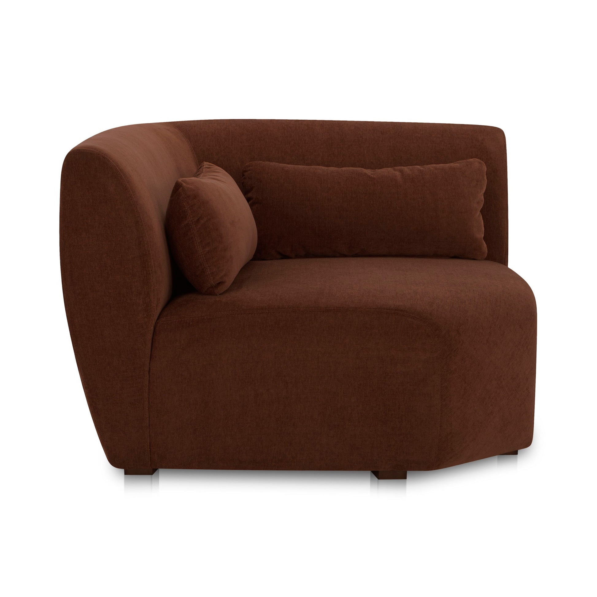 Offering a generous seat wrapped in rich, warm-toned upholstery, the Amelia corner chair allows numerous configurations to fit any interior design or spatial requirements. Its high back and sloped arm curvature combine to offer a supportive seat, inviting guests to lounge and relax. For added comfort, a lumbar cushion is perfect for posture as this piece radiates a welcoming ambiance.
