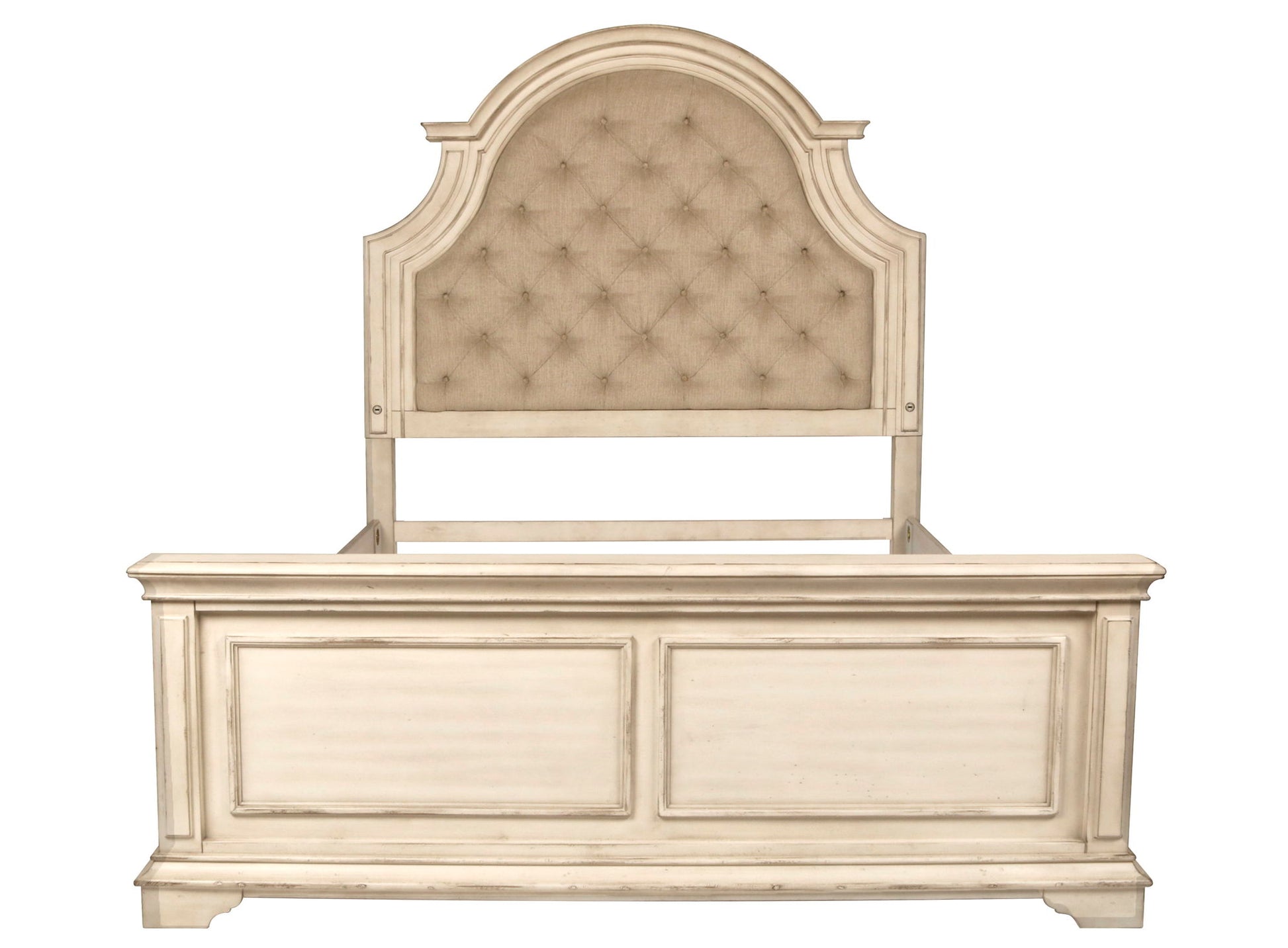 Romance your bedroom with the New Classic Furniture Anastasia Bed, a marvel of real wood construction crafted from solid poplar and oak veneer for unparalleled durability. The heirloom finish, achieved through a meticulous multi-step process involving wire brushing, clefts, rasping, threading, and rub throughs, creates an upscale, vintage look with each piece being one-of-a-kind. The finish, enhanced with brown and gray burnishing, exudes vintage French country cottage charm. Softly arched molding frames the easy-care 100% polyester button-tufted upholstered headboard, creating a welcoming ambiance. This bed goes beyond aesthetics with functional USB charging ports on either side of the headboard, providing a convenient place to charge devices. All furniture complies with safety standards, ensuring your comfort and peace of mind. With a 1-year limited warranty, the Anastasia Bed seamlessly combines timeless design with modern functionality for a secure and stylish addition to your bedroom.