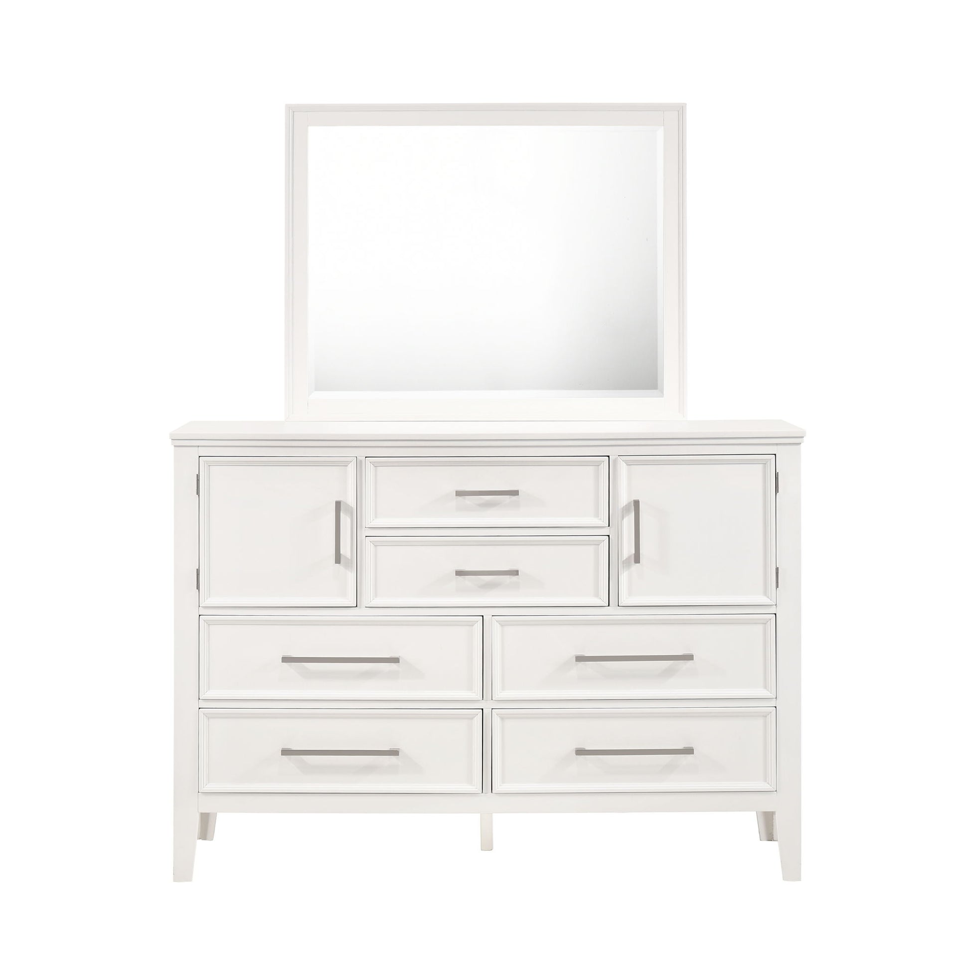The Andover 2-Piece Wood Dresser and Mirror Set offers a blend of durability, style, and functionality, making it an ideal addition to any bedroom. This set includes a dresser and a matching mirror, both expertly crafted from solid Rubberwood, manufactured woods, and wood veneers, ensuring long-lasting durability while showcasing the natural beauty of real wood. The rich Nutmeg Brown finish is achieved through a meticulous multi-step process, featuring sand-throughs and white glazing, which imparts a sophisticated, weathered appeal, highlighting the unique grains and characteristics of the wood. The Andover collection’s clean lines and modern rustic style are complemented by sleek, elongated metallic handles that provide a sophisticated contrast to the warm, dark wood finish. The framed drawer fronts add depth and dimension, while the sturdy block-style legs ensure a solid and stable foundation. The drawers glide smoothly on robust Kenlin drawer glides and feature dovetail joinery, a testament to superior craftsmanship. The set is completed by the pristine, low-distortion beveled glass mirror, encased in picture frame-style moldings that offer a clean, elegant look, enhancing any space with timeless sophistication.