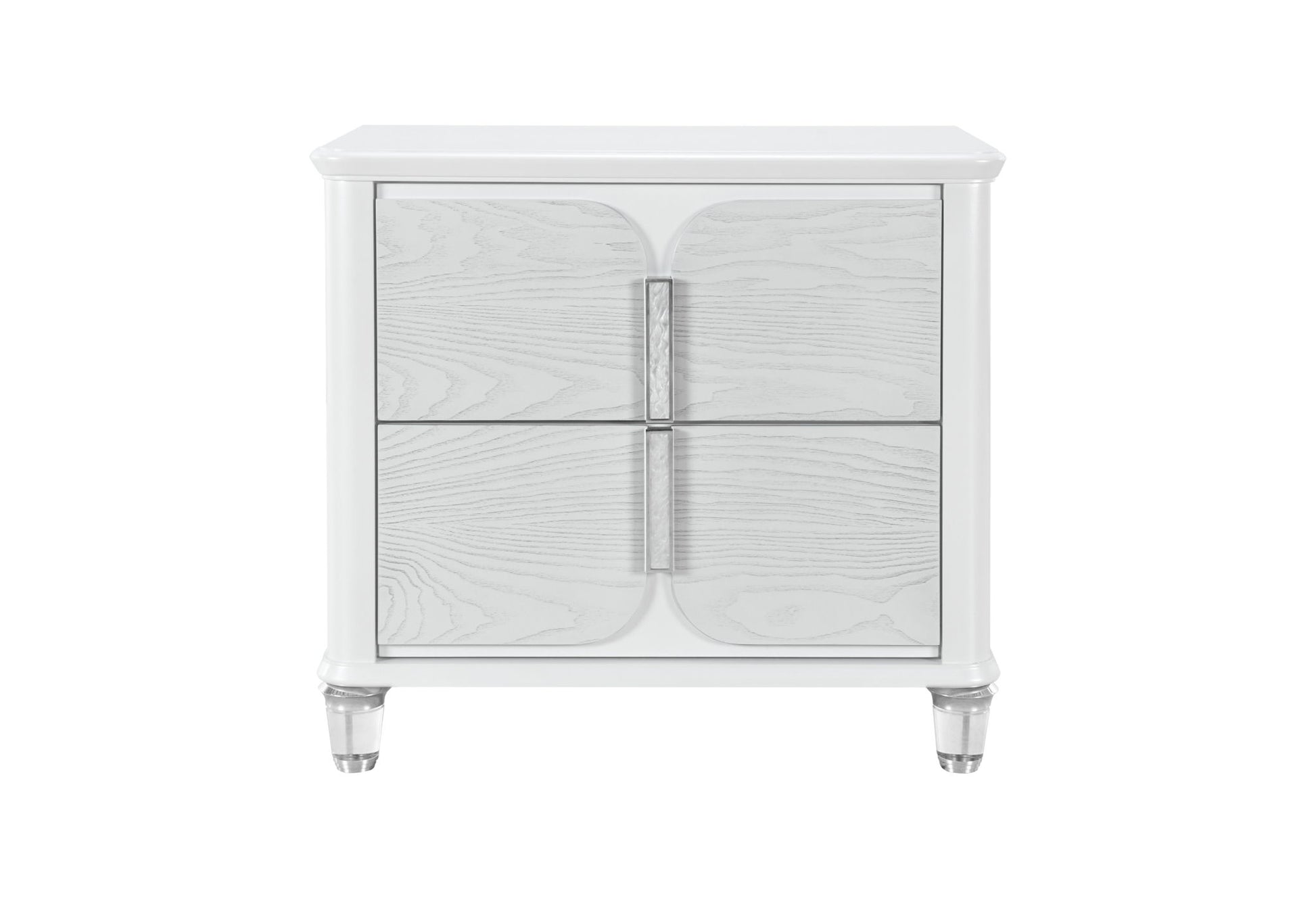 The Apollo Nightstand offers convenience and style, with textured drawer fronts and acrylic legs. Perfect for keeping essentials close at hand, it complements the collection beautifully.