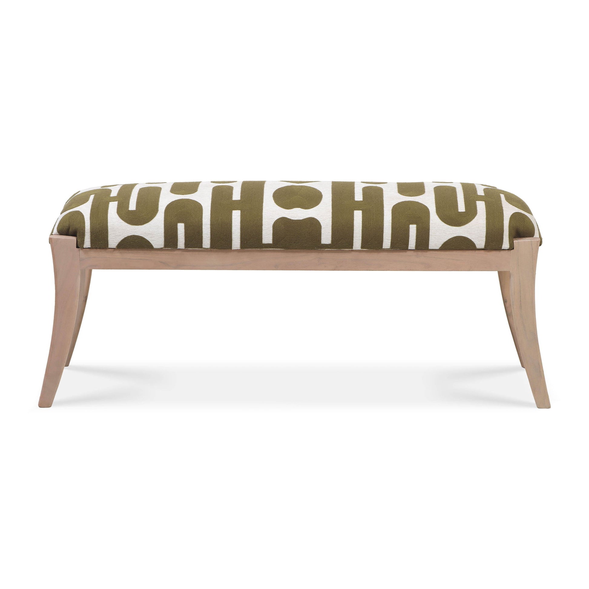 Discover the perfect blend of comfort and style with the Arielle Olive & White Embroidered Bench. Wrapped in textured natural fibers of cotton and jute, this bench boasts a solid acacia frame for enduring durability. The oversized tribal and bohemian-inspired embroidery infuses any room with a touch of artisanal charm.