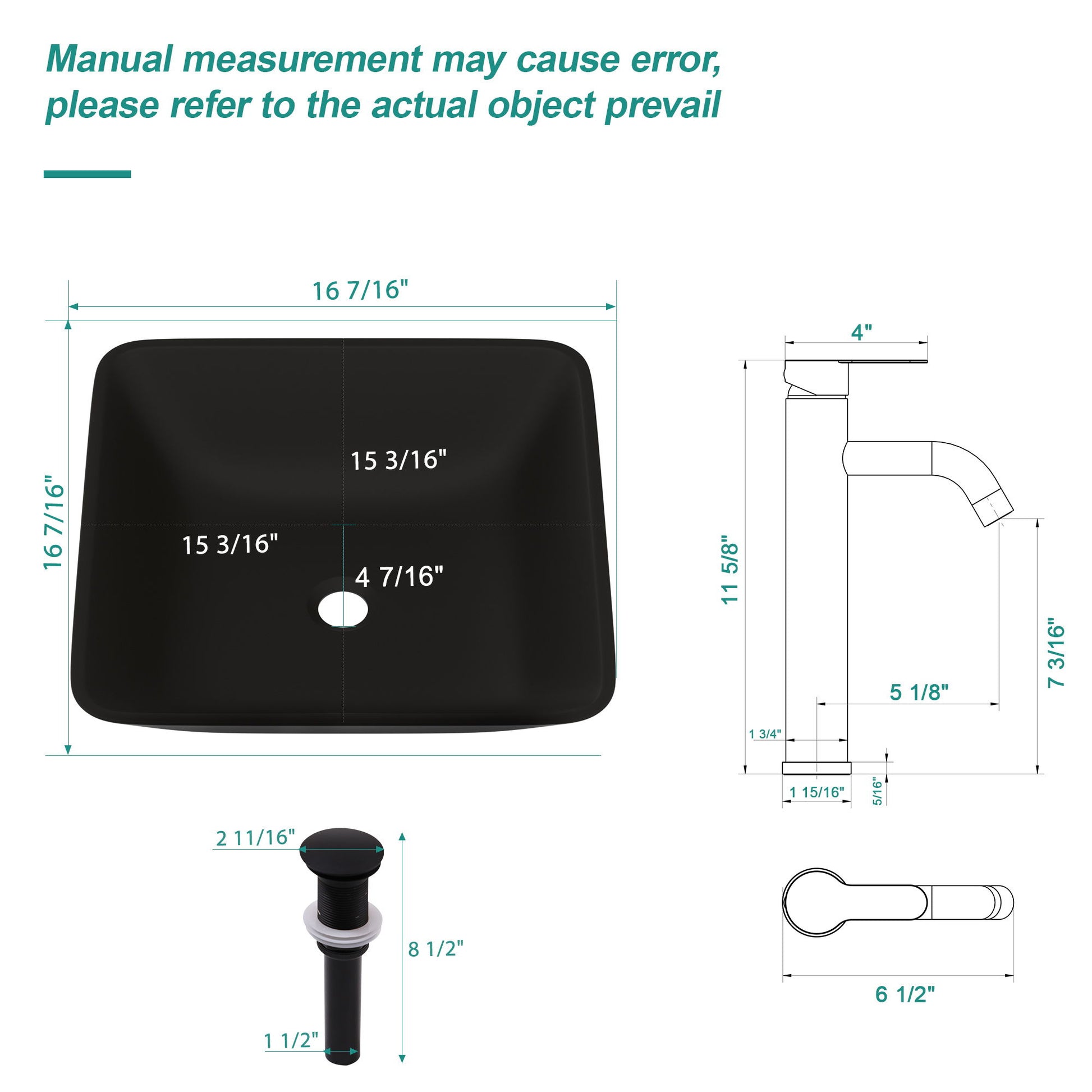 • Dimension & Accessories: Includes faucet, pop-up drain, and water lines; sink measures 16.42 x 16.42 x 4.41 inches.