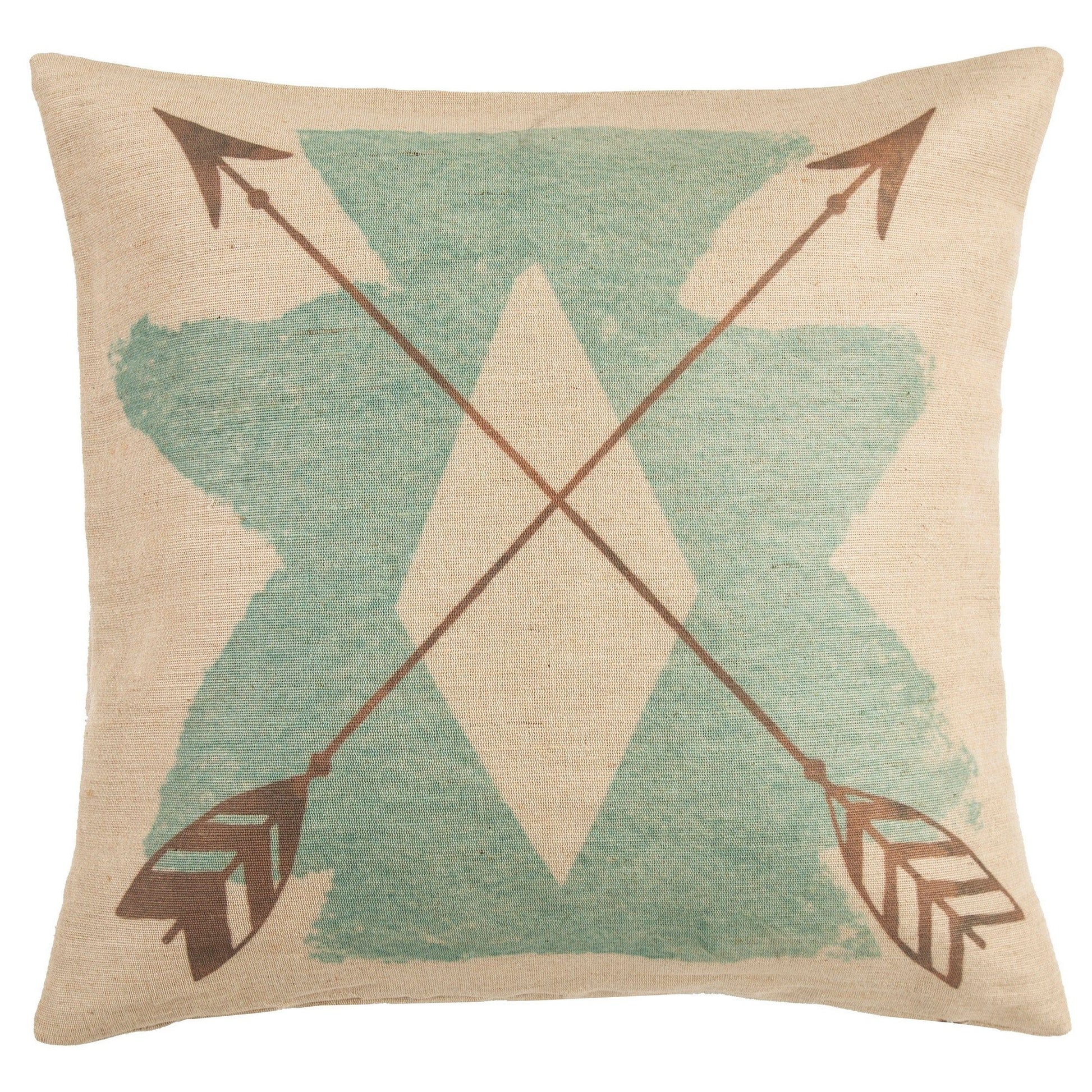 Add southwestern flair to your home with the burlap turquoise aztec pillow. Burlap fabric blends in well with many décor styles. What's Included 1 Pillow Dimensions 18"W x 18"L Materials Shell: 100% polyester; Fill: 100% waterfowl feathers Care Spot clean recommended.
