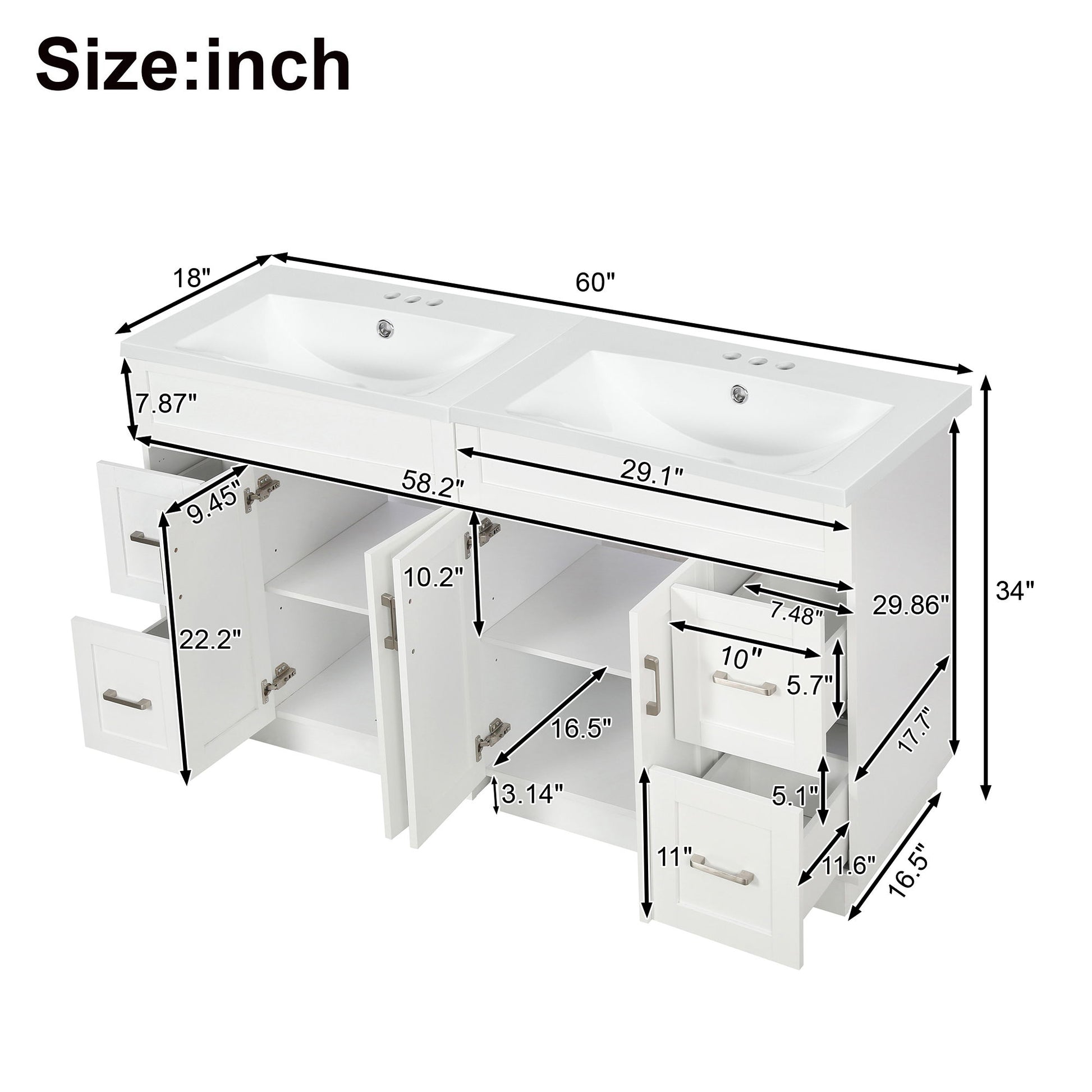 Bathroom Vanity With 4 Cabinet Doors, 4 Drawers, Dual Sinks, Hidden Soft Close Slides And Hinges - White
