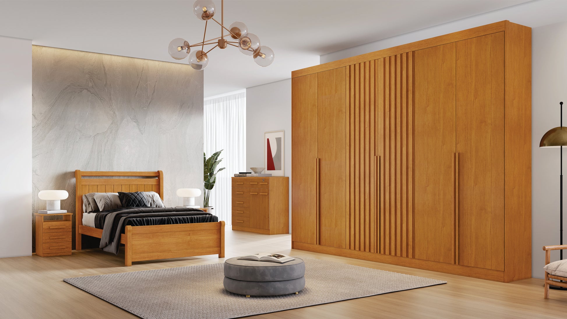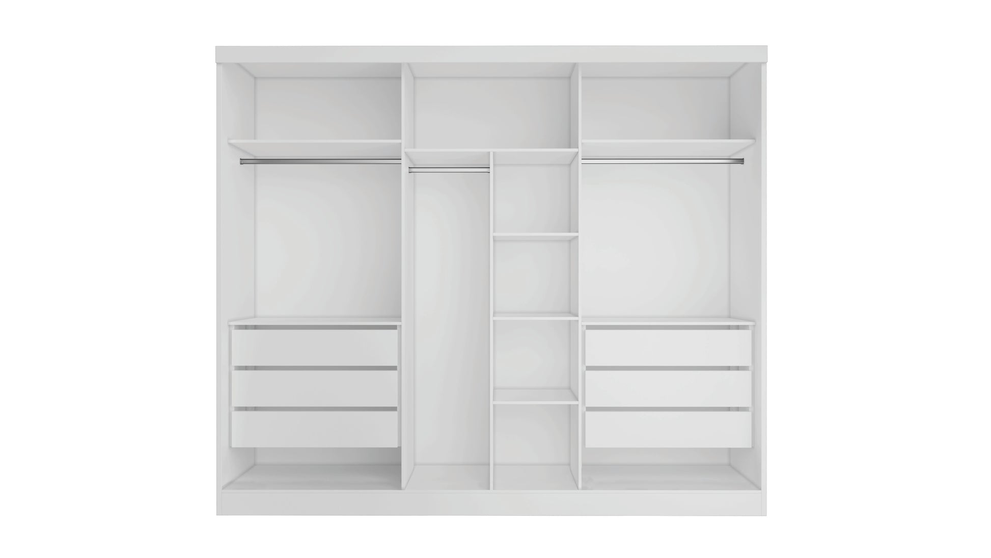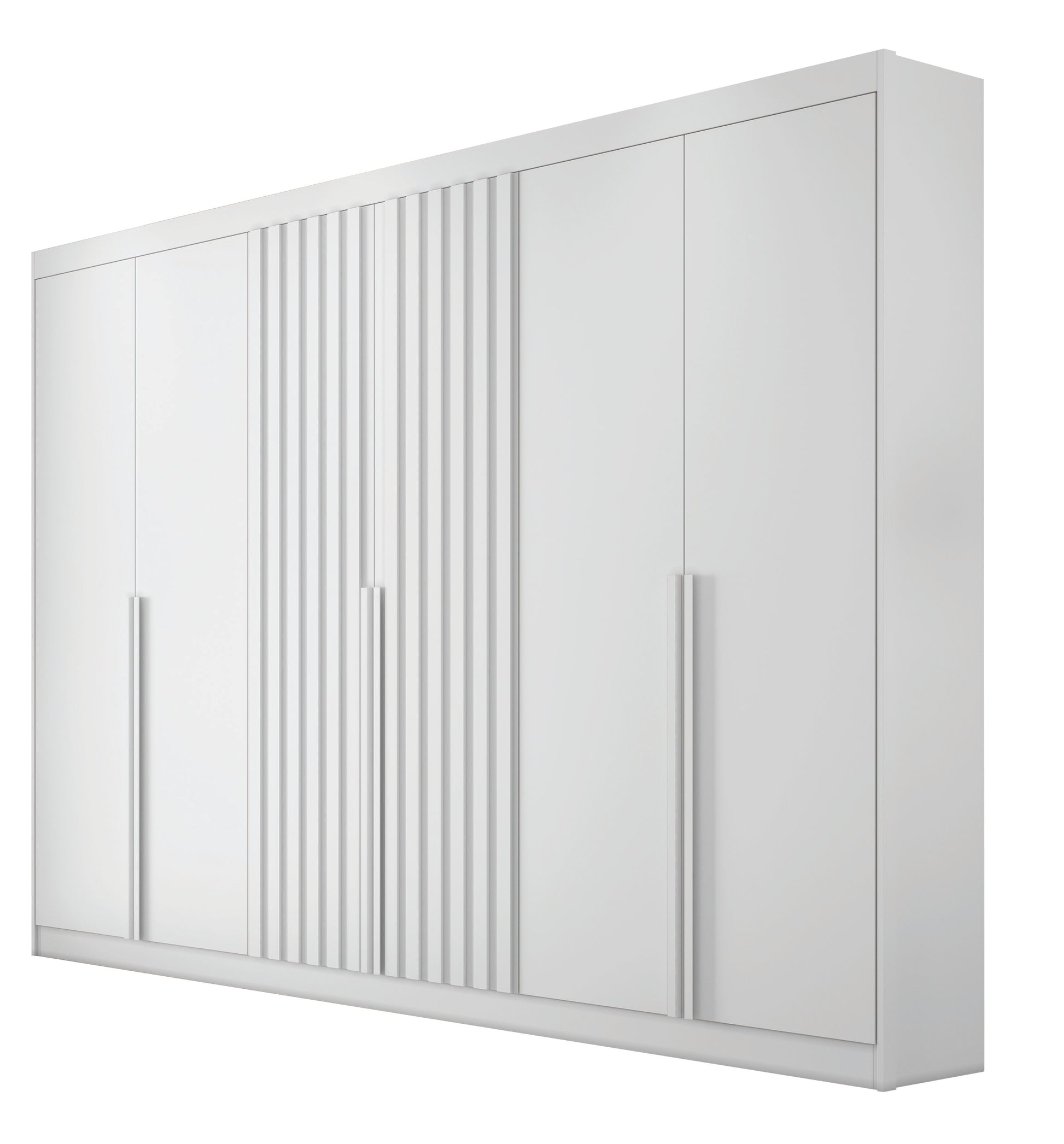Crafted with a 100% MDF structure, this wardrobe offers both durability and elegance. Its spacious interior is thoughtfully designed with a "His and Hers" layout, providing the perfect solution for organizing everything you need. Featuring 6 doors, including 2 central slatted doors, it combines functionality with timeless style.