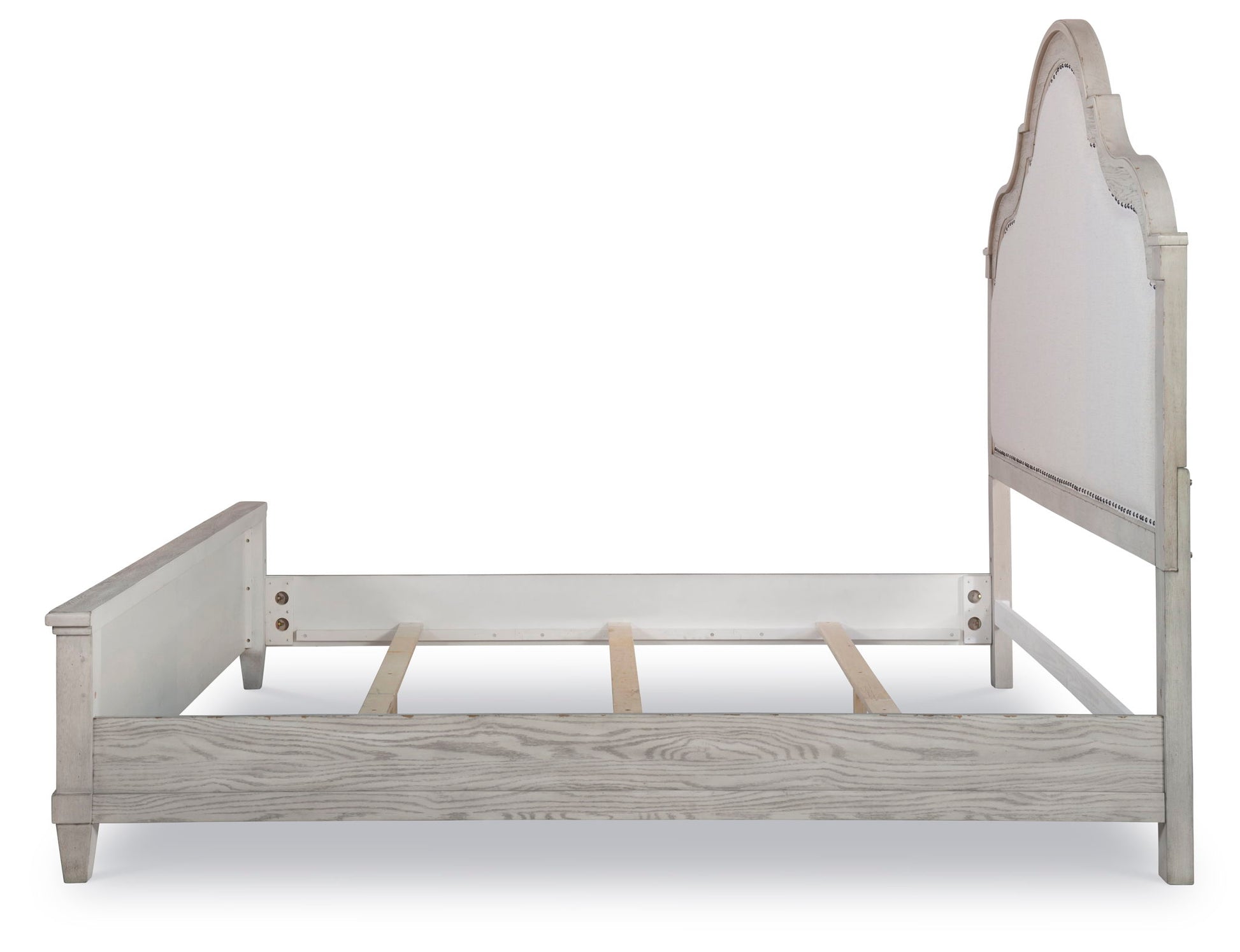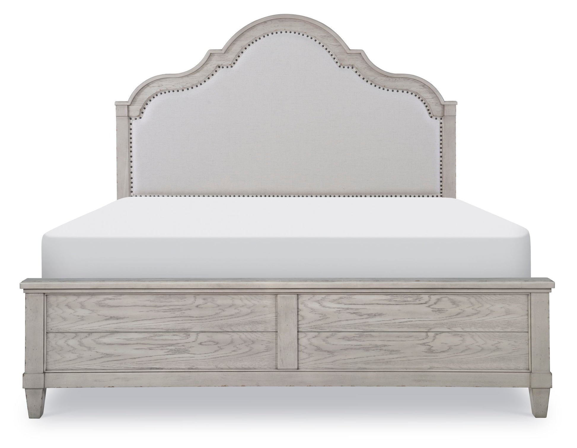 Create an inviting space with lots of character with Belhaven upholstered panel bed. A truly relaxed and welcoming style, the coastal, cottage and modern farmhouse design elements found through out blend well and create a versatile tone. The Weathered Plank finish has a white washed look with wire brushing, distressing and worn edges that all add to the authentic feel. A nailhead trim outlines the upholstered headboard in a graceful arched shape. The panel footboard and angular tapered legs add solid structural elements. The Belhaven upholstered bed will add style and value to the home for years to come.