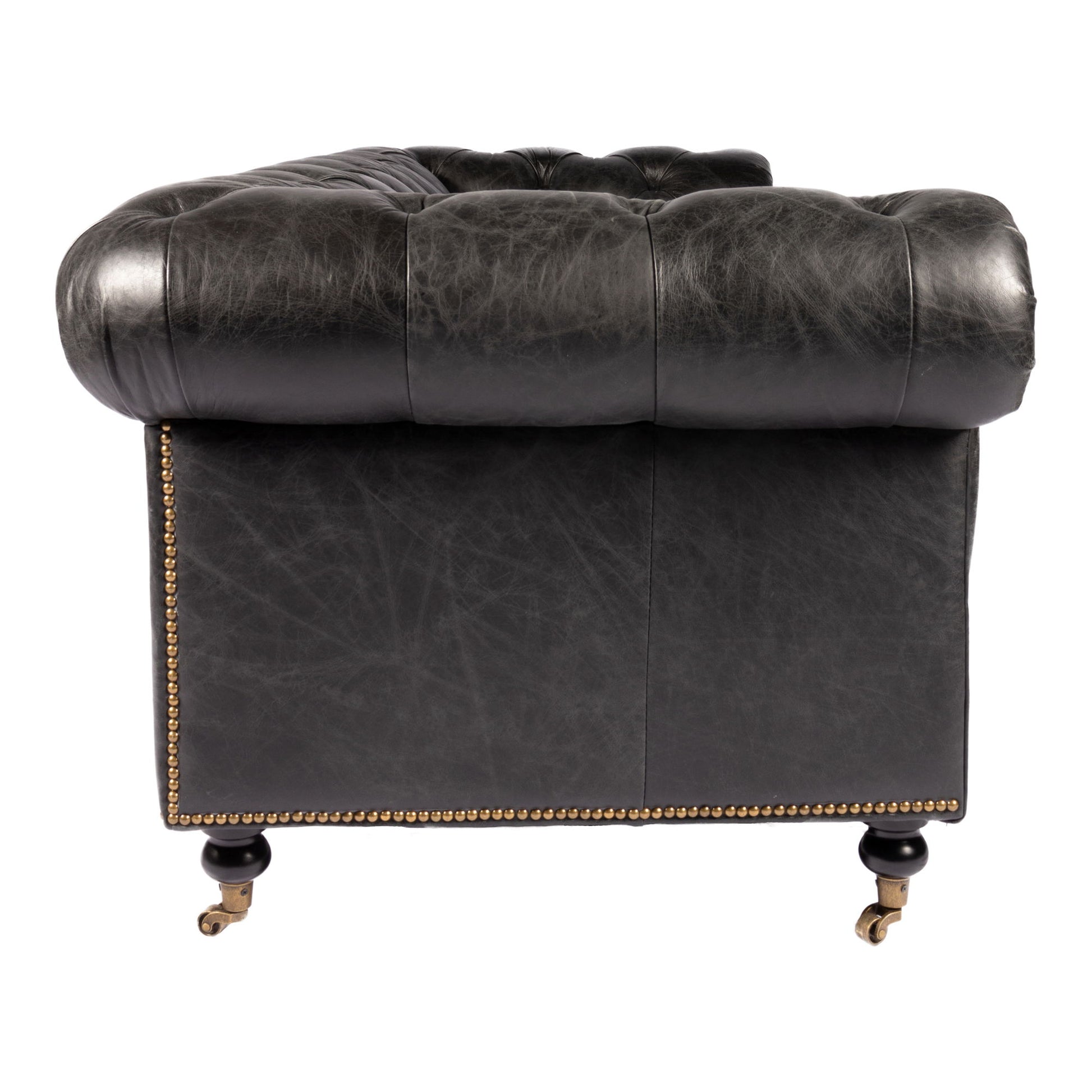 Capturing the bold elements of traditional design, the Birmingham Sofa adds sophistication to your living space with its top-grain leather's deep charcoal. Sharp details are apparent in the chesterfield's tufted back, rolled arms, and meticulously placed brass detailing—pairs nicely with an Old Fashioned.
