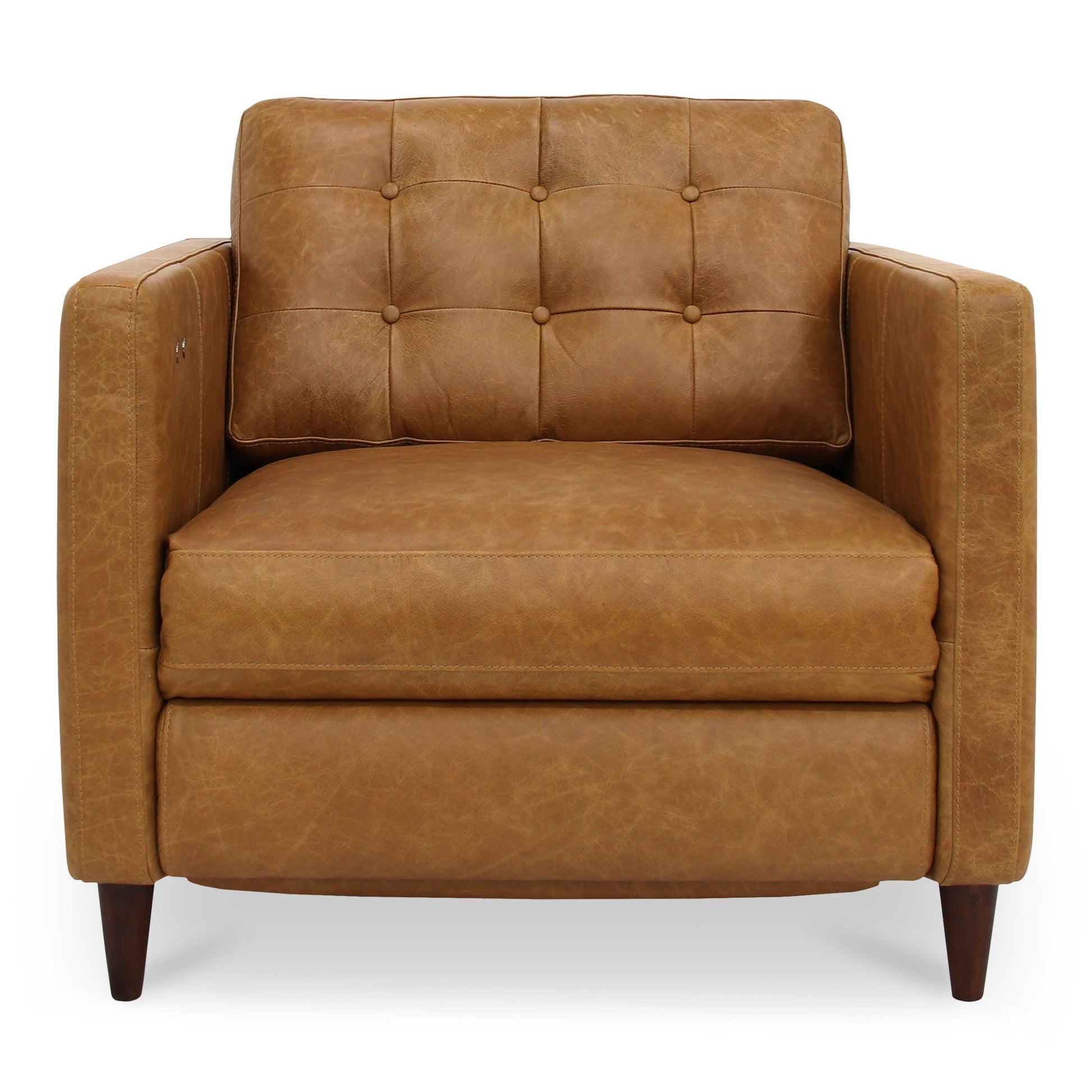 The Bridgers power recliner chair's slim frame features an Okin power motion recliner lift with a 52.5" power cord with a 3.5m extension cable. Wrapped in beautiful top-grain leather, it presents a timeless sophistication with its contemporary comfort.
