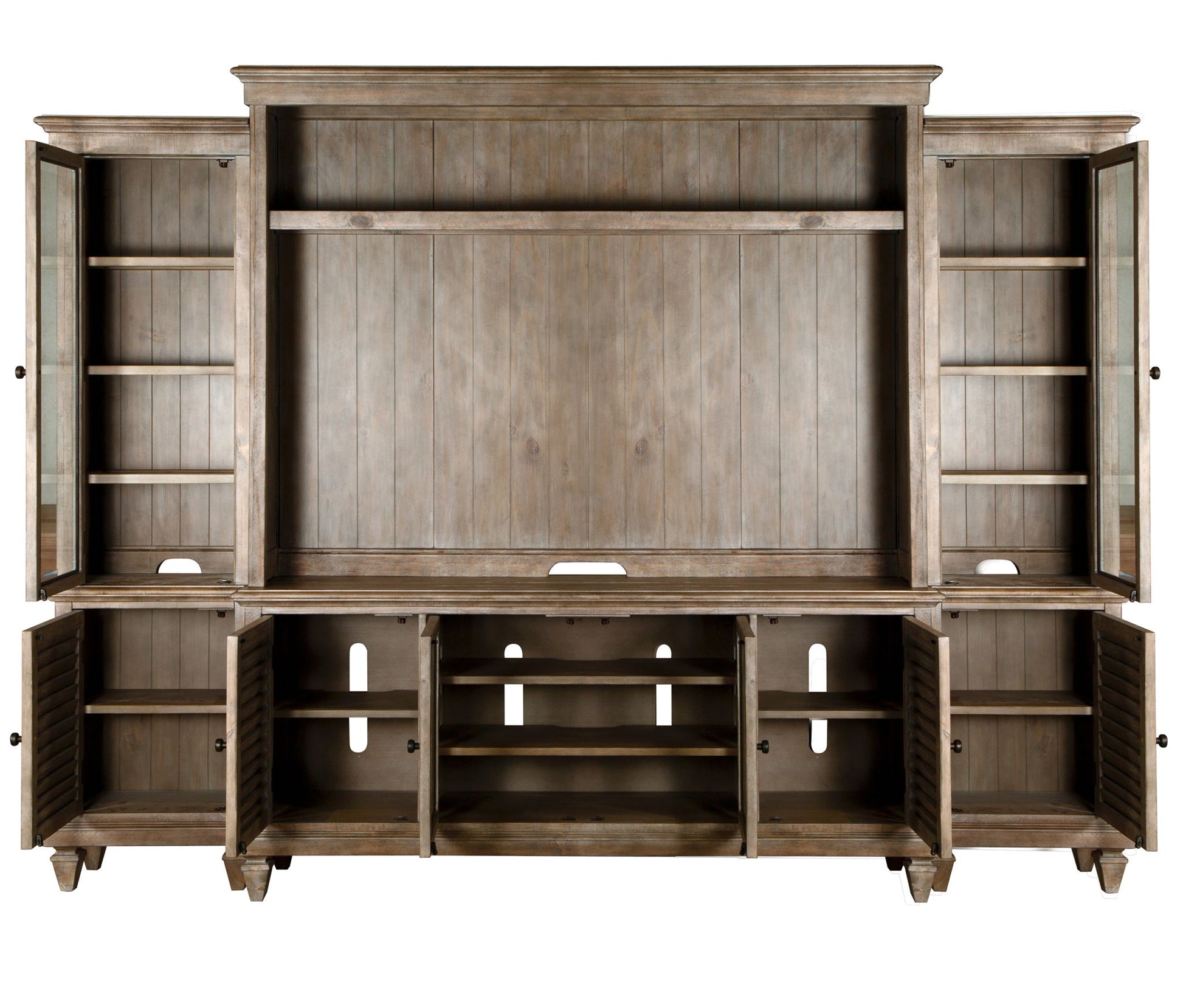 Refined design and casual and rustic appeal marry functionality to a ‘T’ in Lancaster. Crafted of Pine solids with handsome beadboard like panels in an updated Dovetail Grey finish and accented by Weathered Bronze pulls and the fully equipped Lancaster is the ideal media solution. The media console makes the perfect standalone unit with glass center doors featuring expert wire management and two closed doors. Add the optional hutch for an enclosed unit with adjustable wood shelf and lighting or complete the crisp and updated relaxed feel with optional left and right pier units that feature a glass top door and closed storage below for more storage and an entire wall of fully equipped lit storage and function.