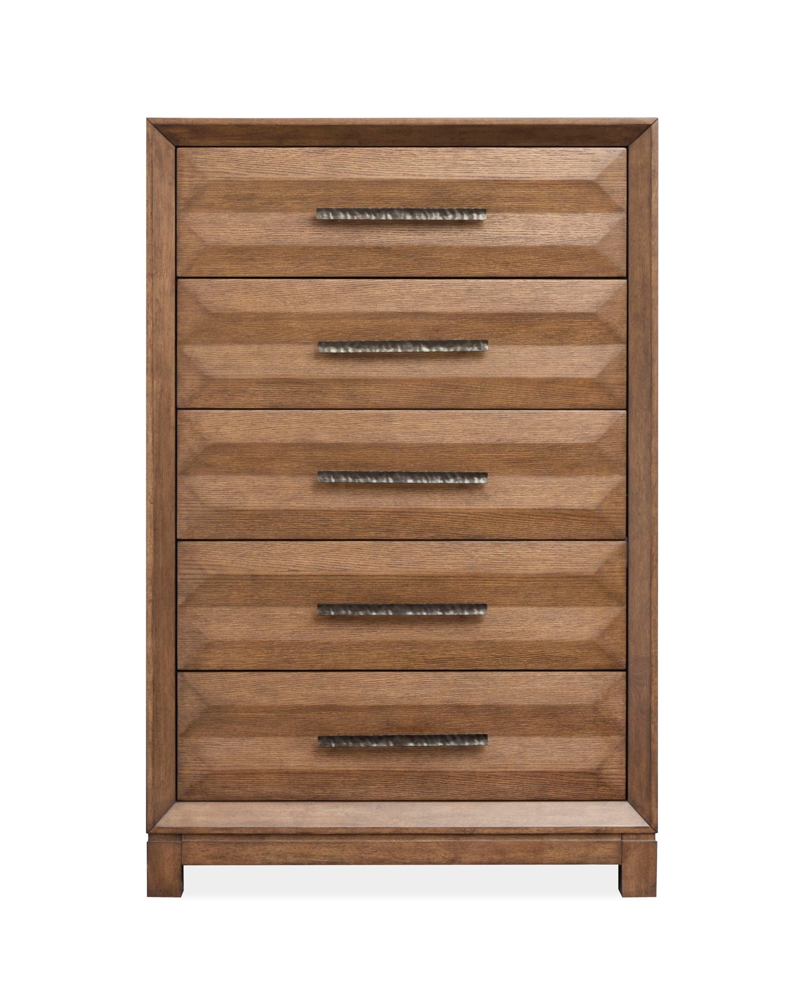 Shown in a rich Bourbon Brown finish with antique bronze hardware and Callisto brings a fresh take to modern rustic style. Crafted from quartered Oak veneers and the collection features bold geometric shaping and textured bar pull hardware that nestles neatly into the angled valleys of the drawer fronts. Perfectly scaled for apartments and starter homes and this collection offers big style in a smaller footprint—with value pricing that makes it even sweeter. The upholstered bed stands out with a dimensional and uniquely channeled headboard design that feels lively yet welcoming—ideal for pairing with textured bedding. Inspired by "California Modern Rustic" design and this collection masterfully blends refined and geometric forms with organic textures and a relaxed lodge-like feel. Callisto strikes the perfect balance between modern sophistication and rustic comfort and creating a serene and stylish retreat.