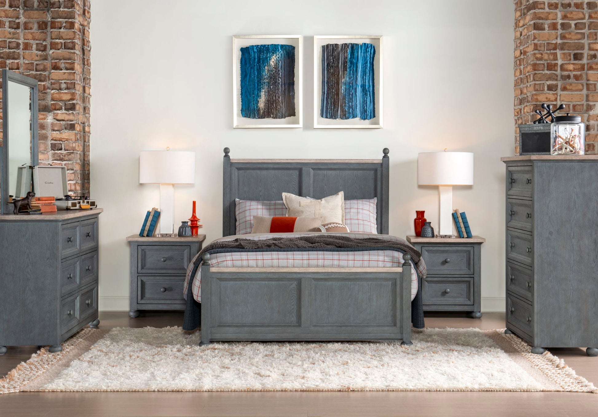 Beautifully crafted and versatile,, Cone Mills is a country inspired bedroom collection offering several options for sleep,, study and storage. Rustic finishes,, clean lines,, heavy framed drawer fronts,, ball feet and thick tops combine to create a substantial feel with a cozy and relaxed tone. The Distressed Denim finish on frames and hardware,, along with the Stone Washed tops add subtle contrast and elevates the timeless styling.