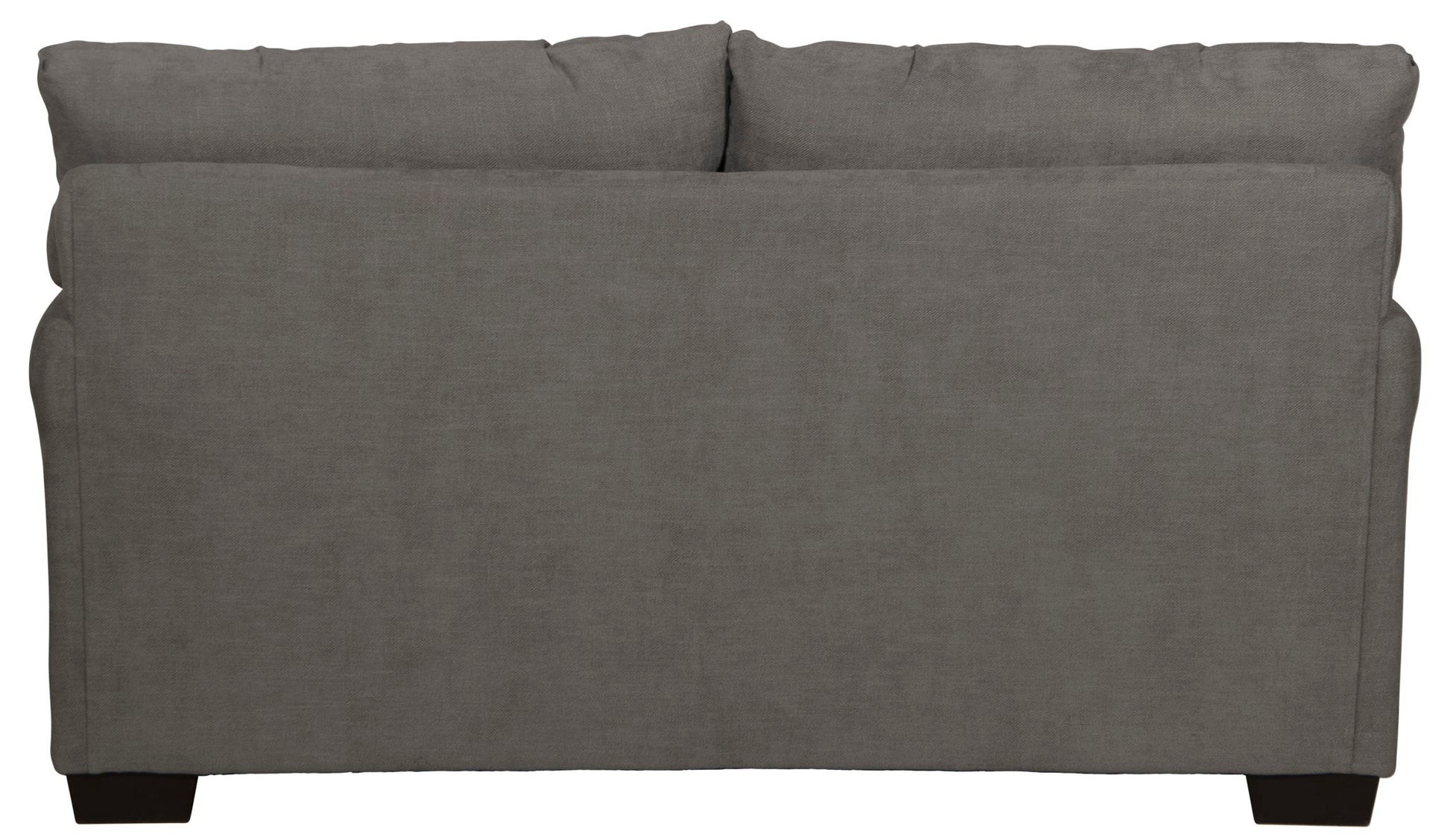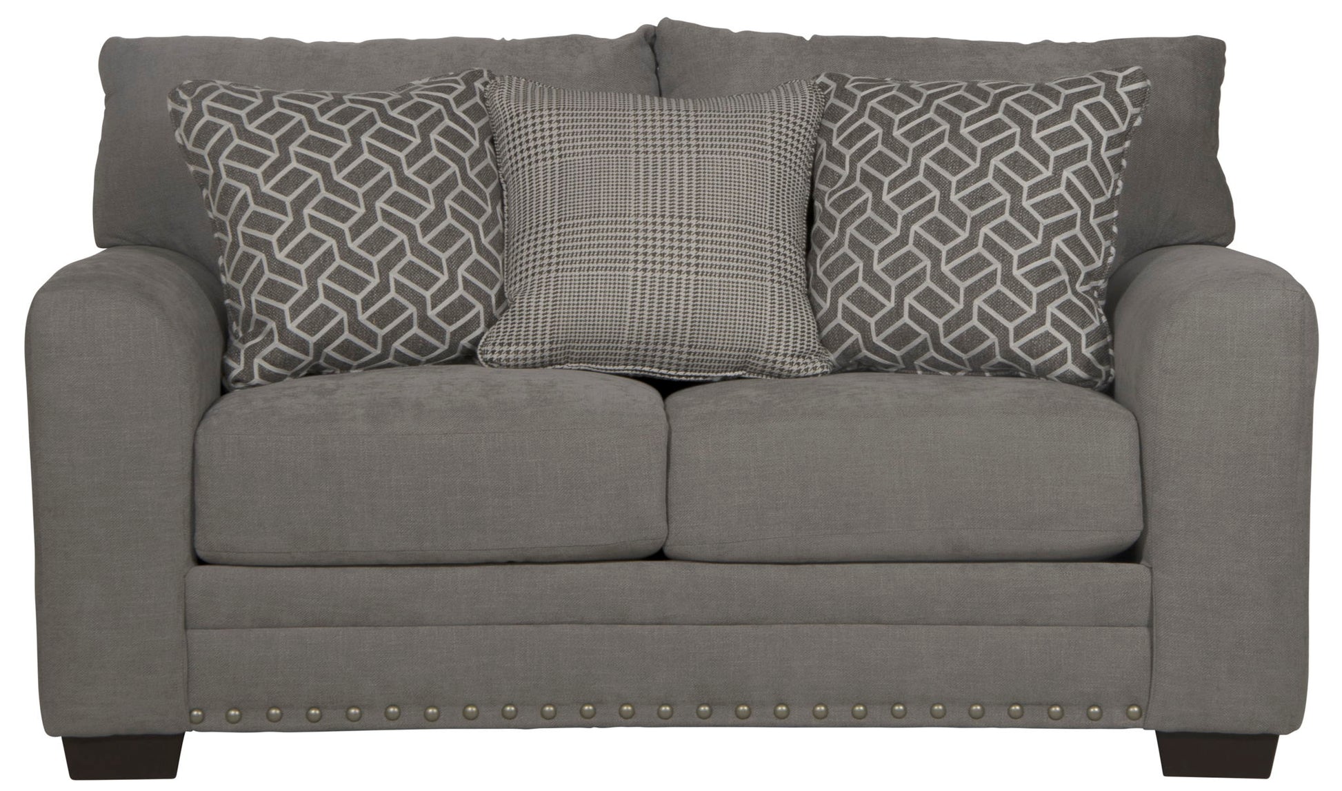 The contemporary farmhouse styling of the Cutler loveseat brings comfort and style to any room. Built for comfort, the seats are constructed of individually pocketed coils encased in foam and topped with a layer of cool gel infused memory foam for a long lasting, comfortable and supportive seat. Covered in a soft, durable 100% polyester body fabric in a light gray color and accented with coordinating designer toss pillows, the Cutler brings style to any room. The look is completed with pewter finished nailhead accents along the base.