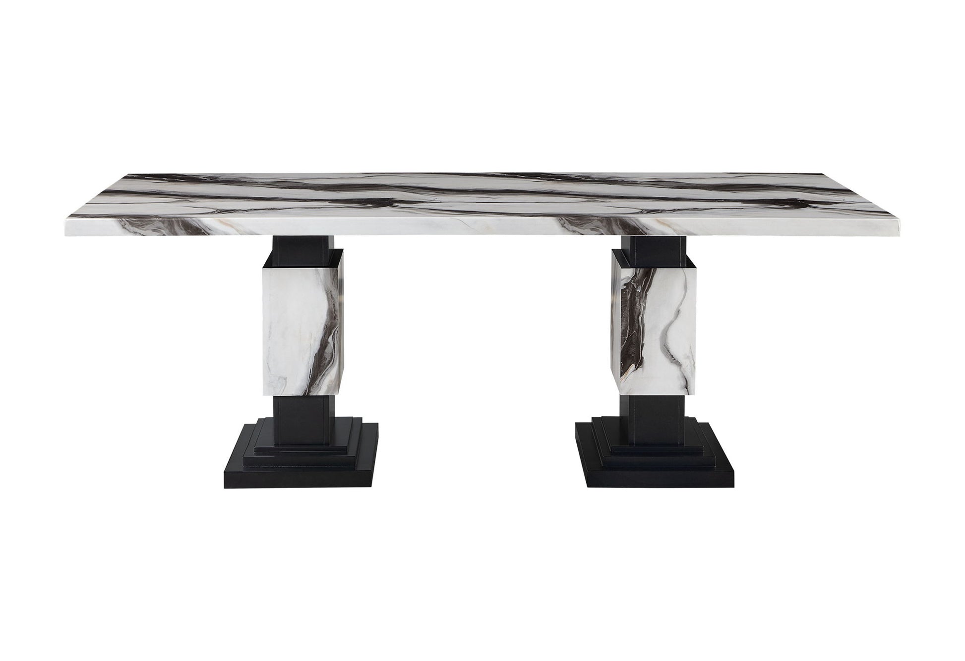 Introducing the D12 Dining Set by Global Furniture, a stunning and contemporary addition to your dining space. This exquisite set combines elegance and durability, perfect for both casual family meals and sophisticated dinner parties. The focal point of this set is the table, featuring a faux marble top that exudes timeless luxury. Its sleek black base with faux marble accents adds a touch of modernity and complements any interior decor effortlessly. Crafted with meticulous attention to detail, the D12 table offers a sturdy construction that ensures years of reliable use. The accompanying chairs are designed to provide both comfort and style. Upholstered in plush black velvet, they offer a luxurious seating experience. The chairs' standout feature is the Chanel tufting on their backs, which adds a touch of sophistication and creates an eye-catching focal point. Whether you're hosting a formal dinner or enjoying a casual family gathering, the D12 Dining Set by Global Furniture is the epitome of refined taste. Elevate your dining area with this exquisite ensemble that seamlessly combines modern aesthetics, durability, and comfort.