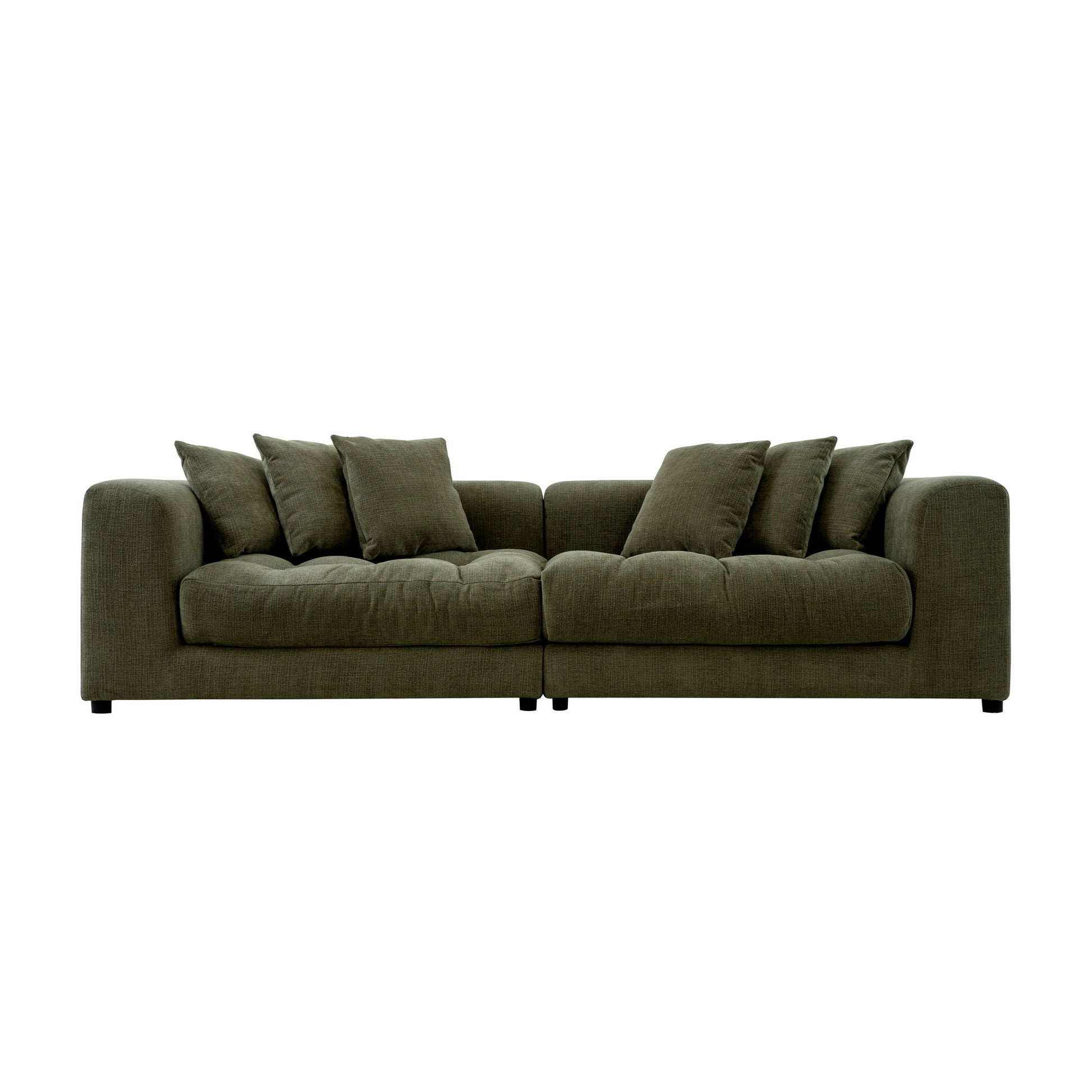 The Davie Sofa's generous scale and deep seat invite serene relaxation. Tufted seat cushions adorned with feather and fiber toppers create a plush landscape made for lounging. The two-piece sofa in velvety chenille upholstery offers a flexible arrangement as six loose back pillows create personalized comfort.