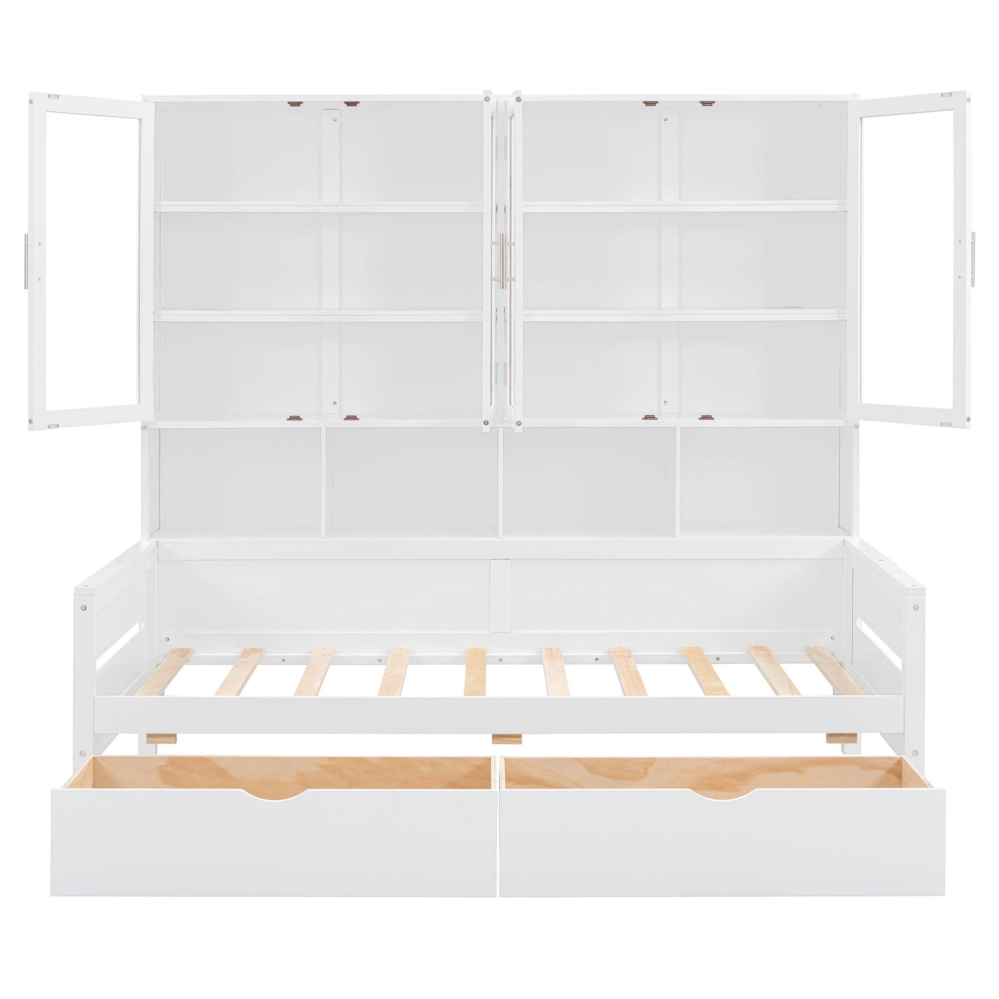 Twin Size Daybed With Glass Door Storage Cabinets, Built In LED Lighting And Shelves - White
