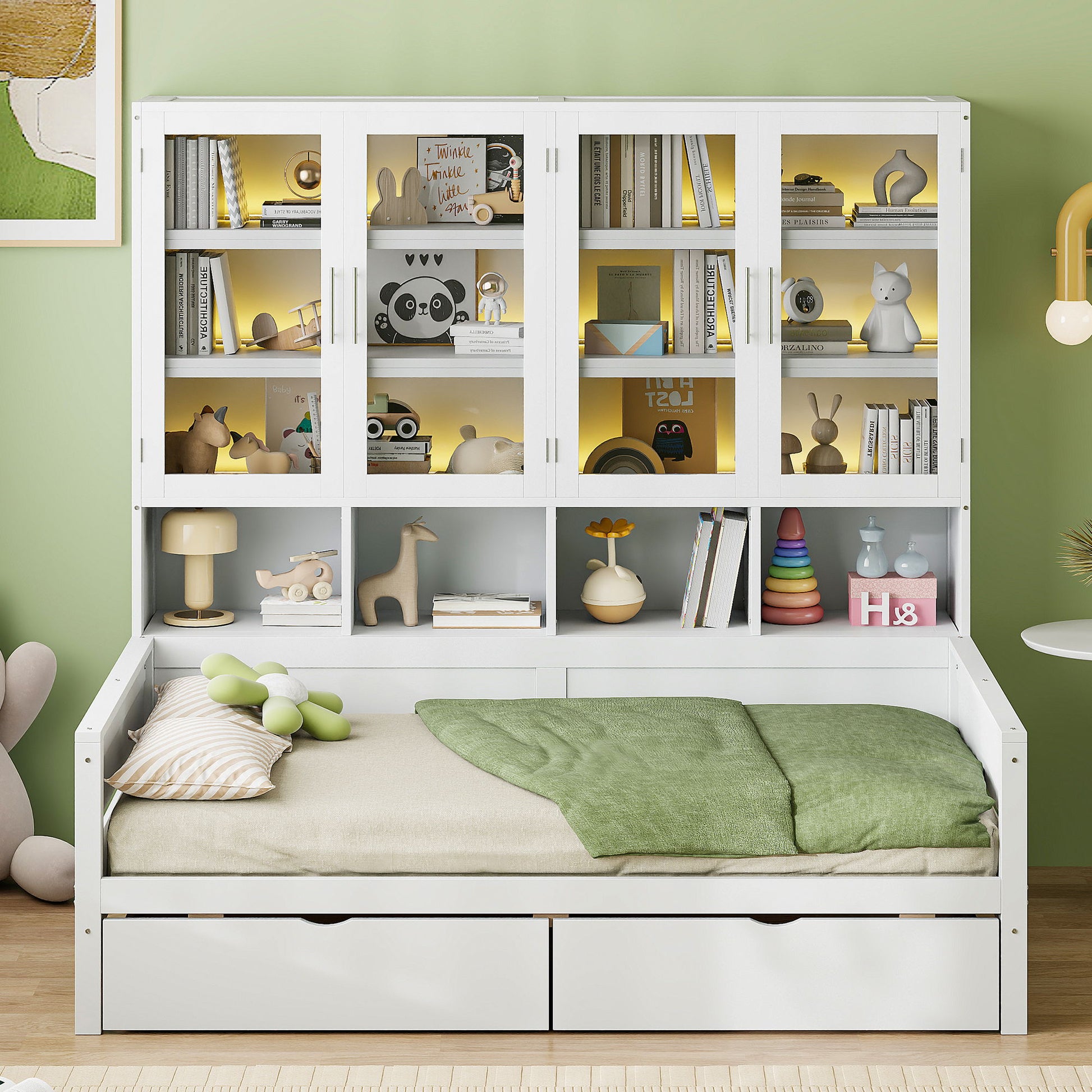 Daybed With Glass Door Storage Cabinets, Built In LED Lighting And Shelves