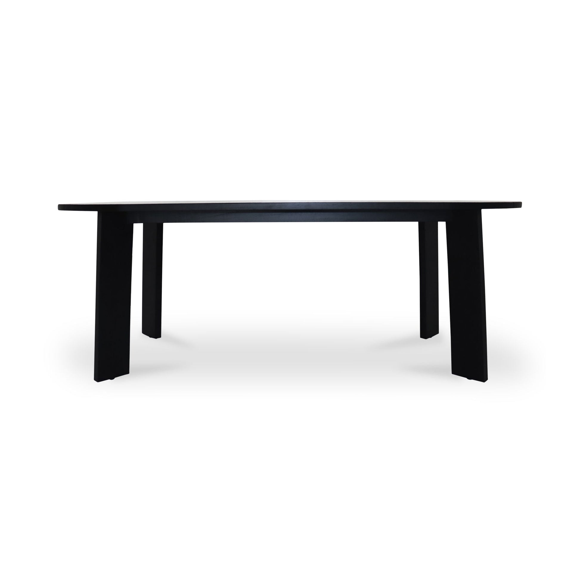 Embodying contemporary sophistication, this solid teak table celebrates natural material. The Delta outdoor dining table's angular legs provide a striking contrast to the oval, curved top, creating a minimalist yet elegant aesthetic. Over time, the table embraces a unique silver-grey patina as the teak and oils naturally weather. Though the process lends to its character, a teak sealer can be applied to maintain its original allure.