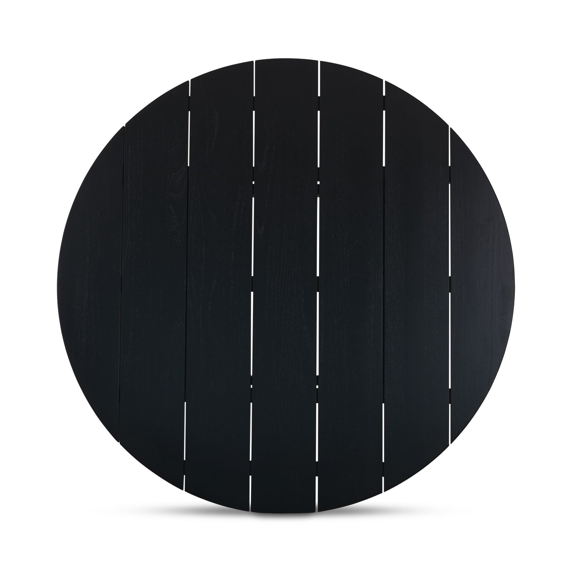 Embodying contemporary sophistication, this solid teak table celebrates natural material. The Delta outdoor dining table's angular legs provide a striking contrast to the round, curved top, creating a minimalist yet elegant aesthetic. Over time, the table embraces a unique silver-grey patina as the teak and oils naturally weather. Though the process lends to its character, a teak sealer can be applied to maintain its original allure.