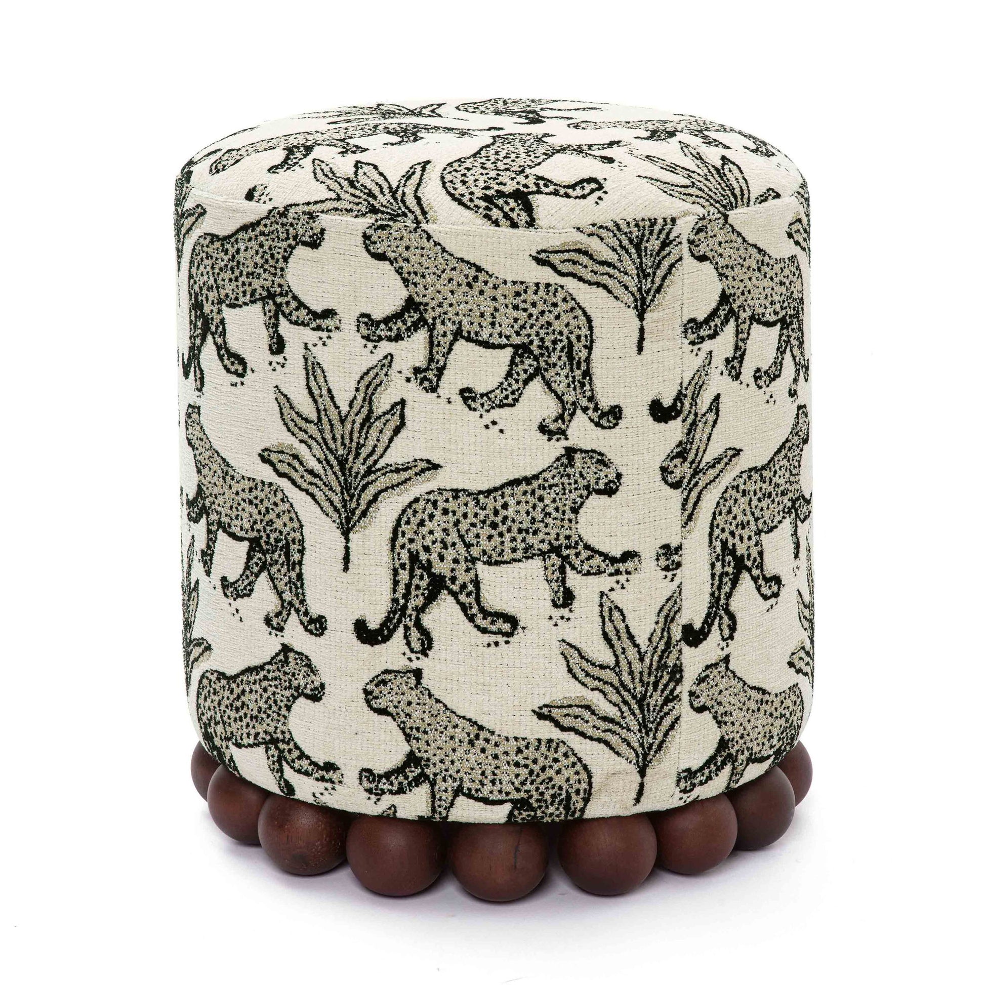 Introducing the Dex Ottomans, a charming and whimsical addition to your space that beautifully blends fresh design with a vibrant tropical vibe. The solid wood spherical orbs at the base create a striking visual element, ensuring a sturdy yet stylish foundation. Choose from playful washed linen-style cabana stripes, eco-friendly upcycled fabric, or bold leopard print jacquard to infuse personality into any room. Perfect for extra seating or as a chic footrest. Transform your space with a touch of fun and flair!