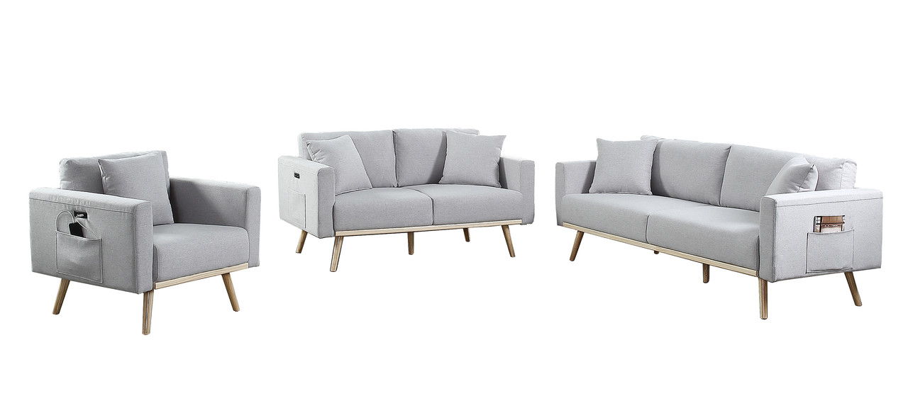 Easton - Linen Fabric Sofa, Loveseat, Chair Living Room With USB Charging Ports Pockets And Pillows (Set of 3) - Light Gray