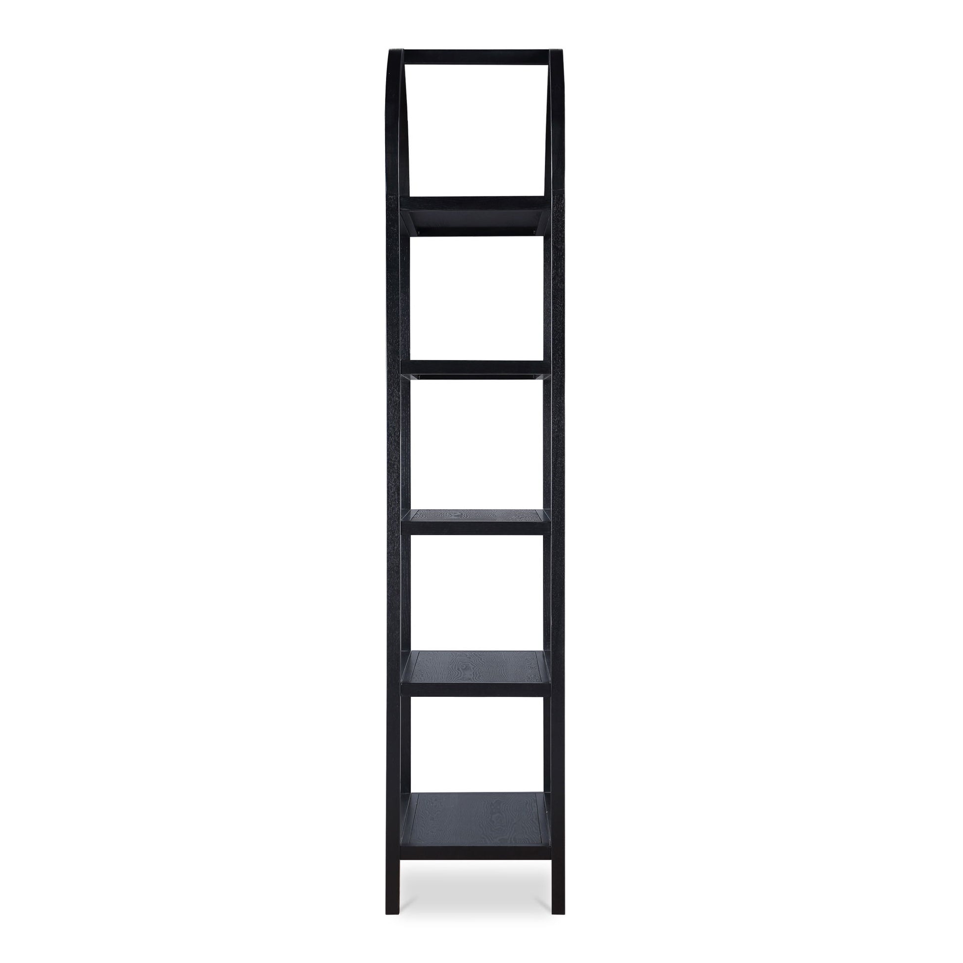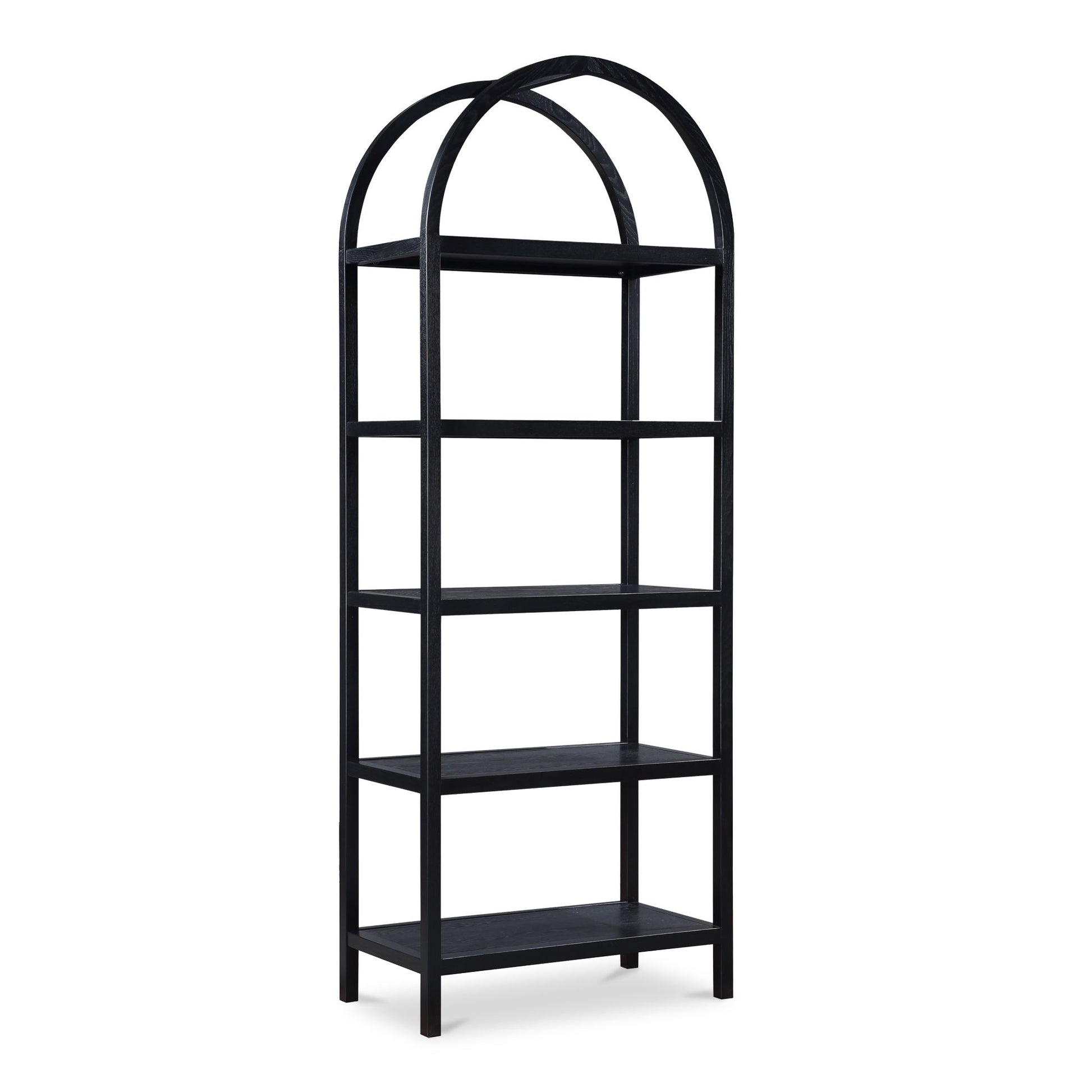An artistic blend of style and sturdiness, the Eero bookcase features a solid oak frame with oak-veneered shelves ready to display cherished books, keepsakes, and collectibles. Its dark finish engenders moody sophistication, while the arch support is a testament to exquisite architectural design.