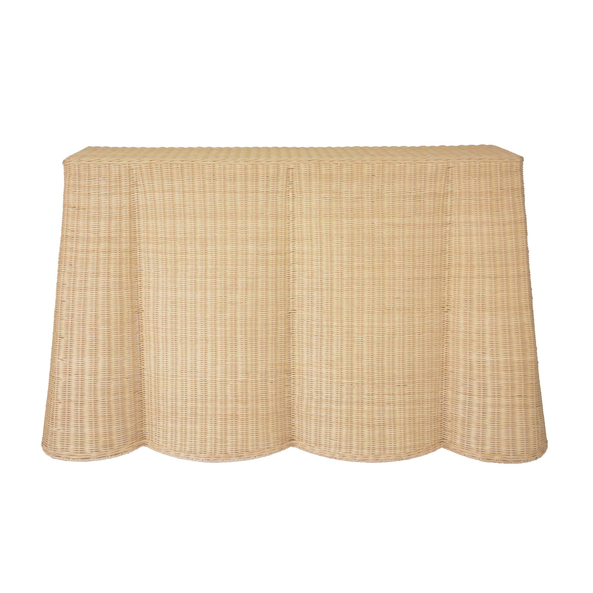 The Egan Natural Rattan Console Table blends airy coastal charm with everyday function, featuring a scalloped silhouette handwoven from naturally harvested rattan over a sturdy metal frame. Lightweight for easy styling yet solidly built with no assembly required, it is ready to showcase your favorite décor anywhere in your home.
