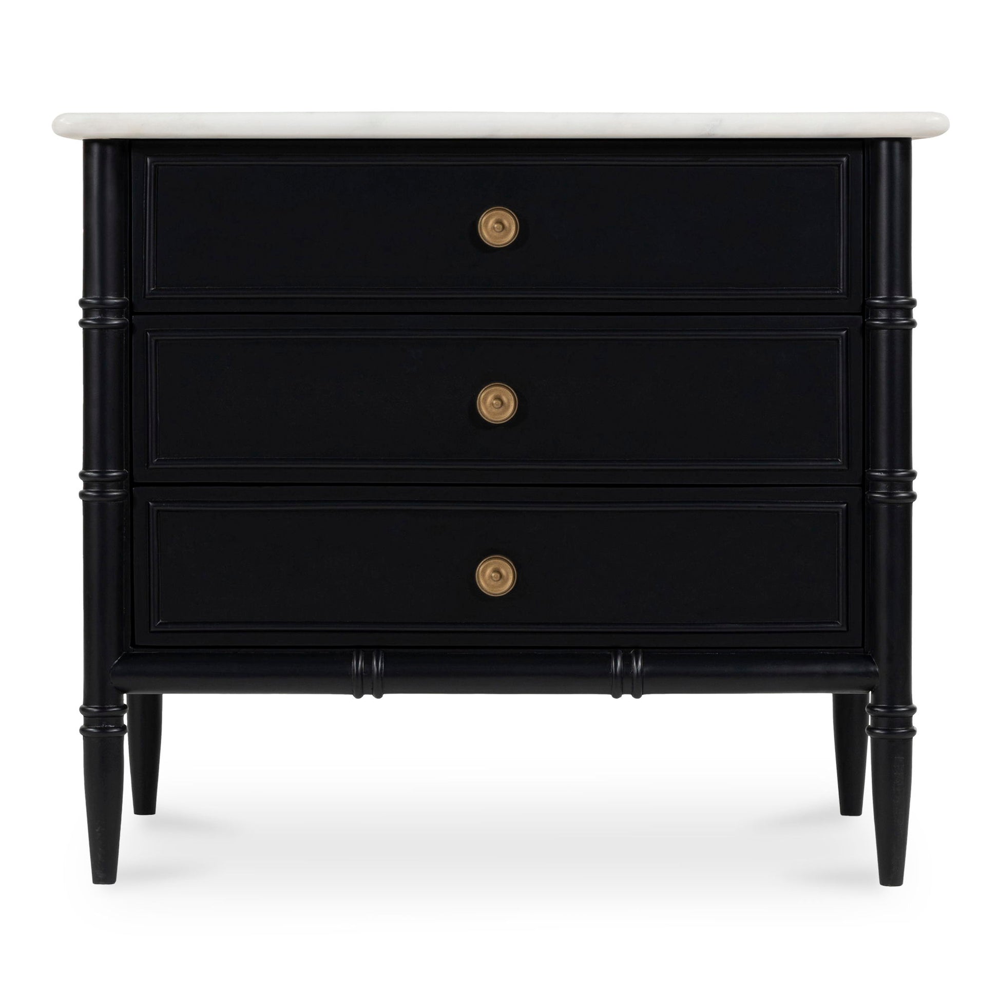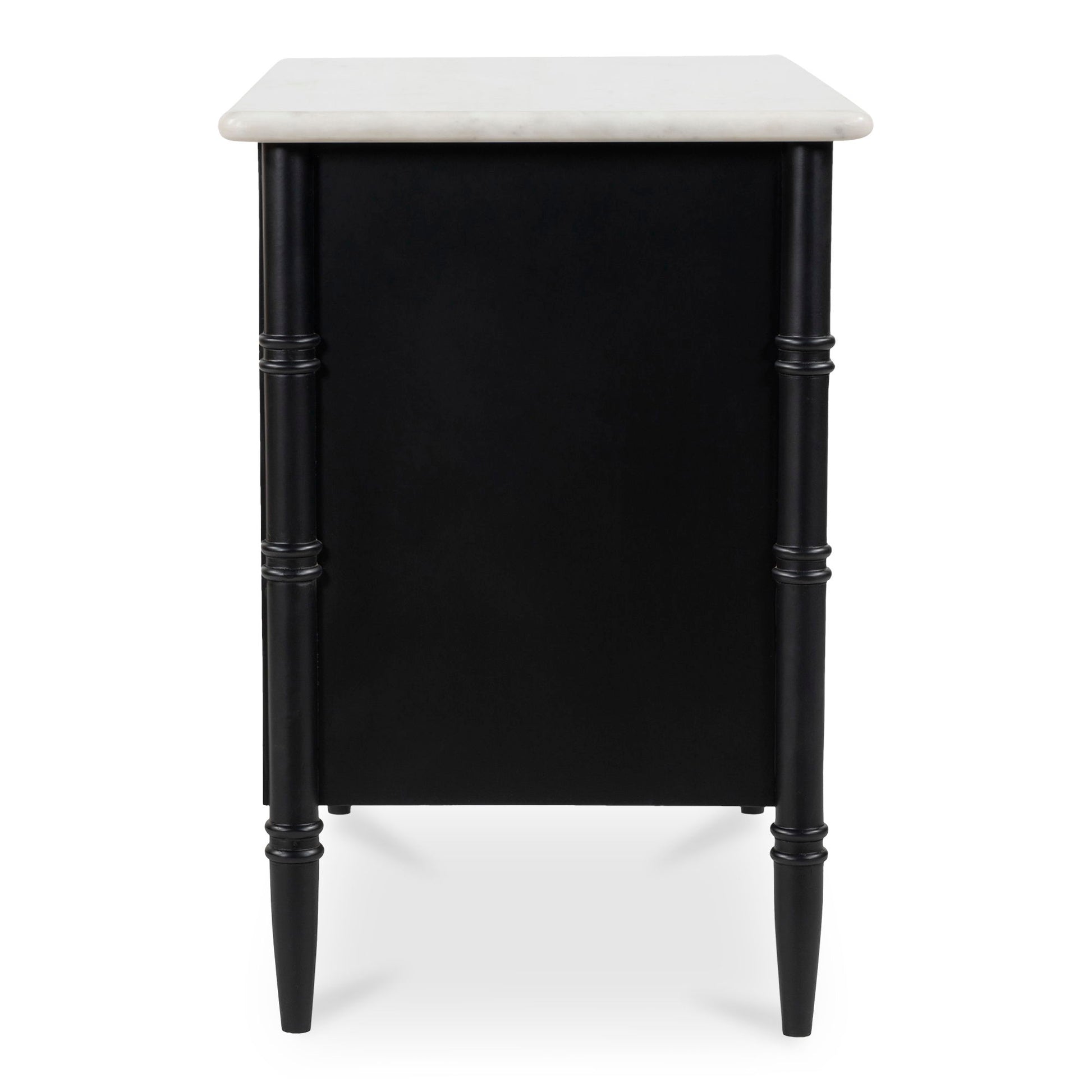 Inspired by the everyday grace of Provence style, the Eleanor nightstand showcases a classically graceful profile with distinctive turned details. Crafted from Mango wood, this piece is crowned with an expressive marble top and finished with solid antique finished brass finish handles, adding a touch of timeless sophistication and natural beauty.