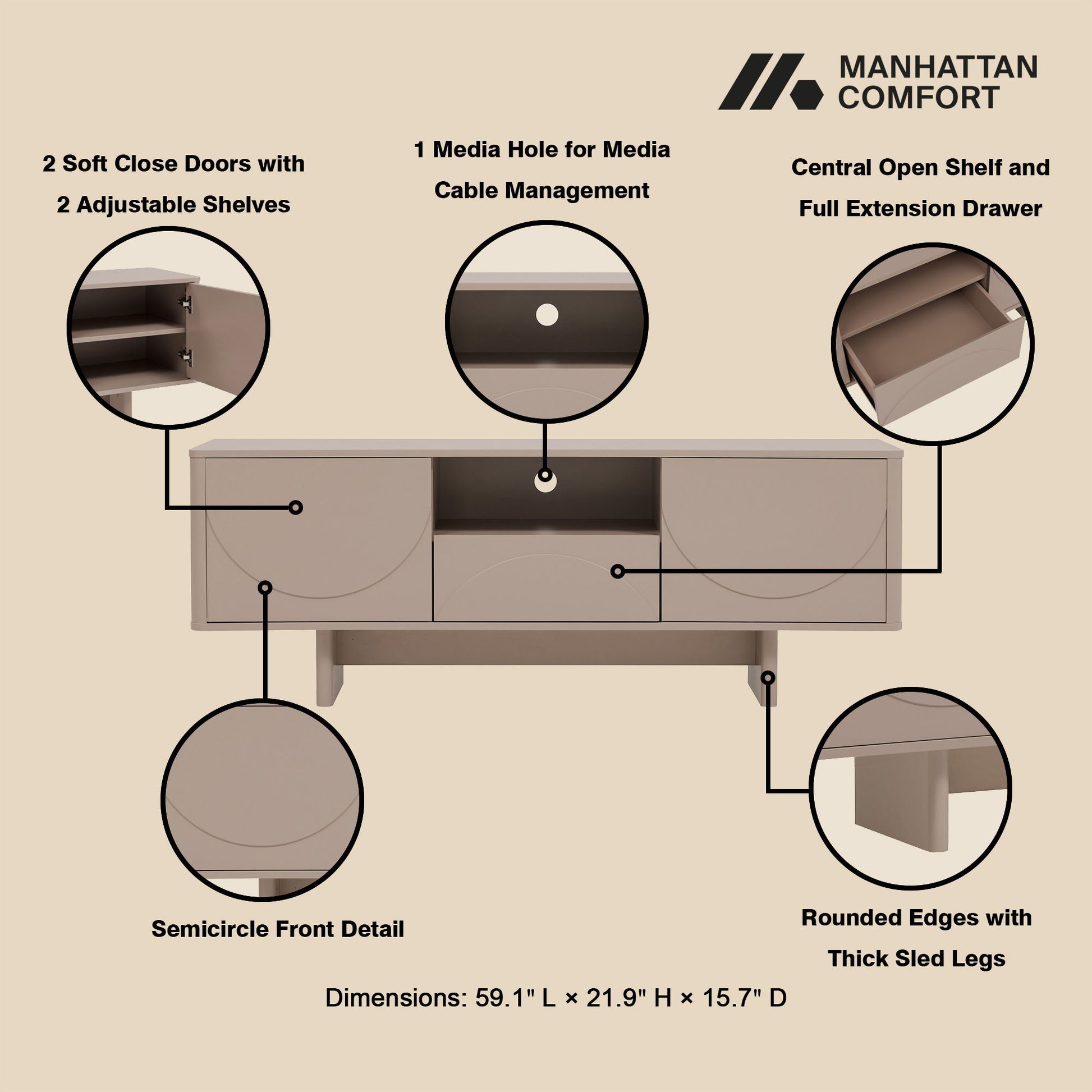 • Full Extension Drawer: Provides easy access to hidden storage for remote controls and media items