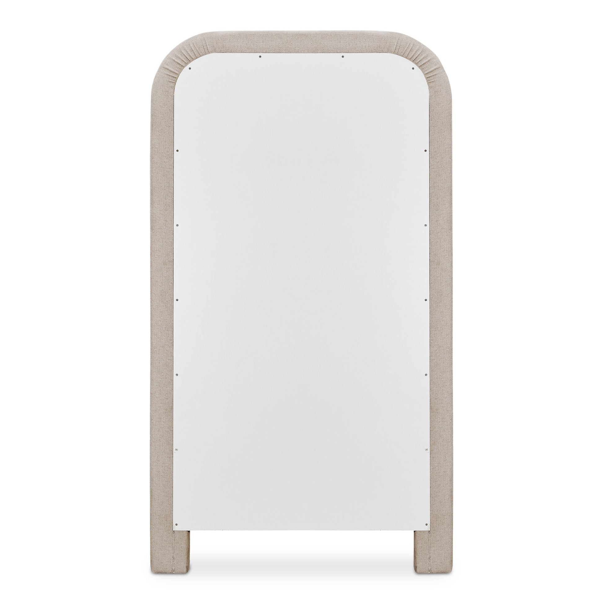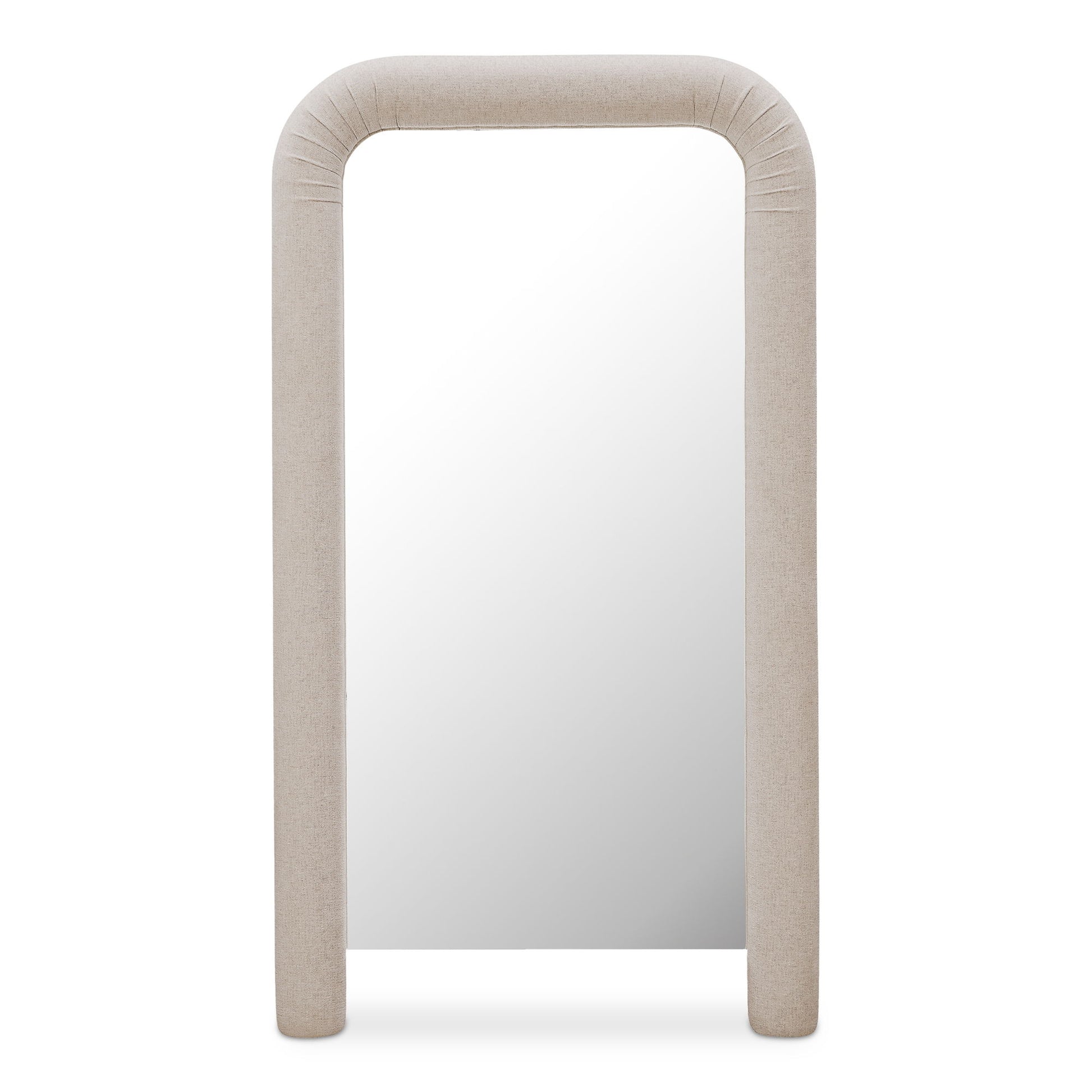 • Large floor mirror with modern, soft corners with ruched detail & soft-touch fabric upholstery