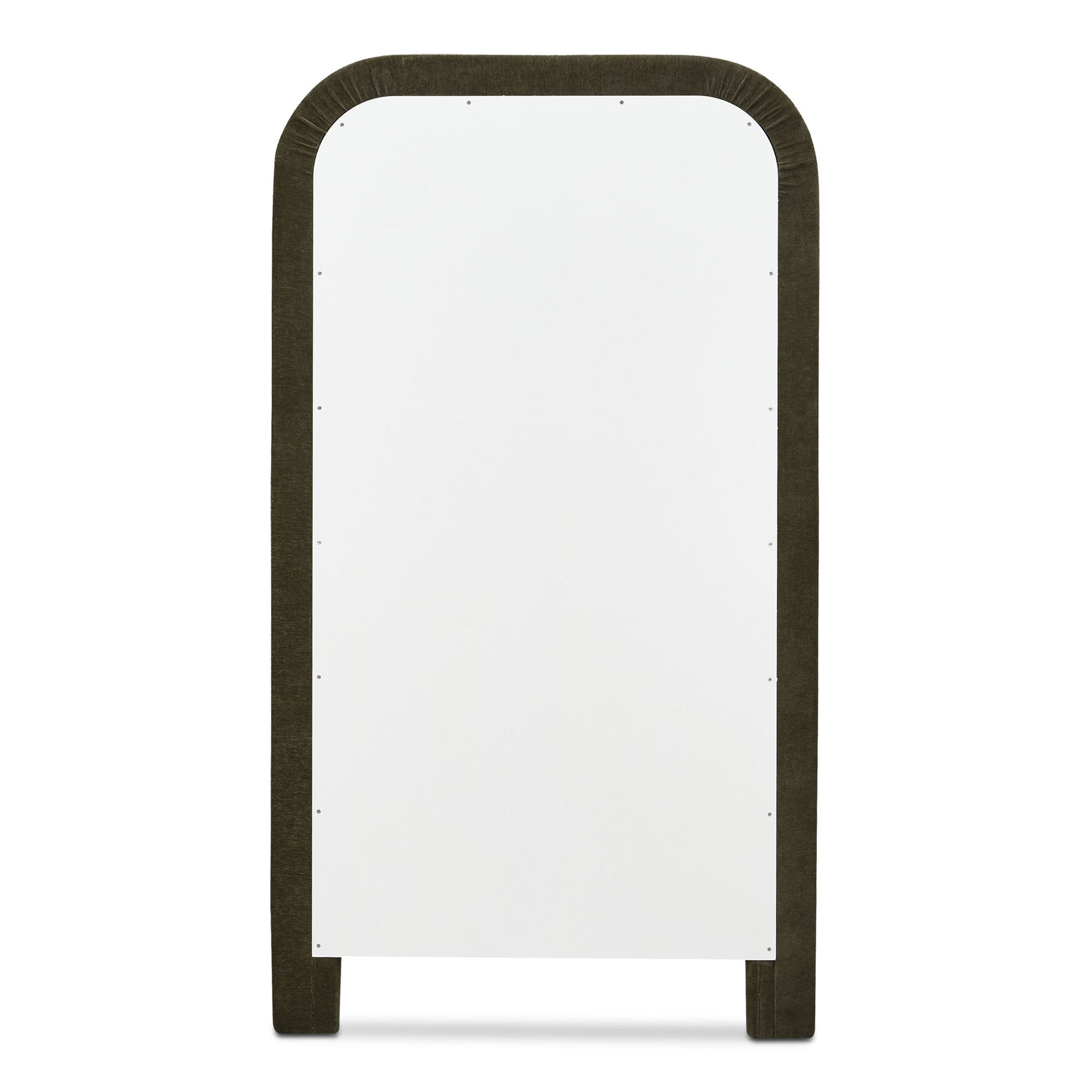 • Large floor mirror with modern, soft corners with ruched detail & soft-touch fabric upholstery