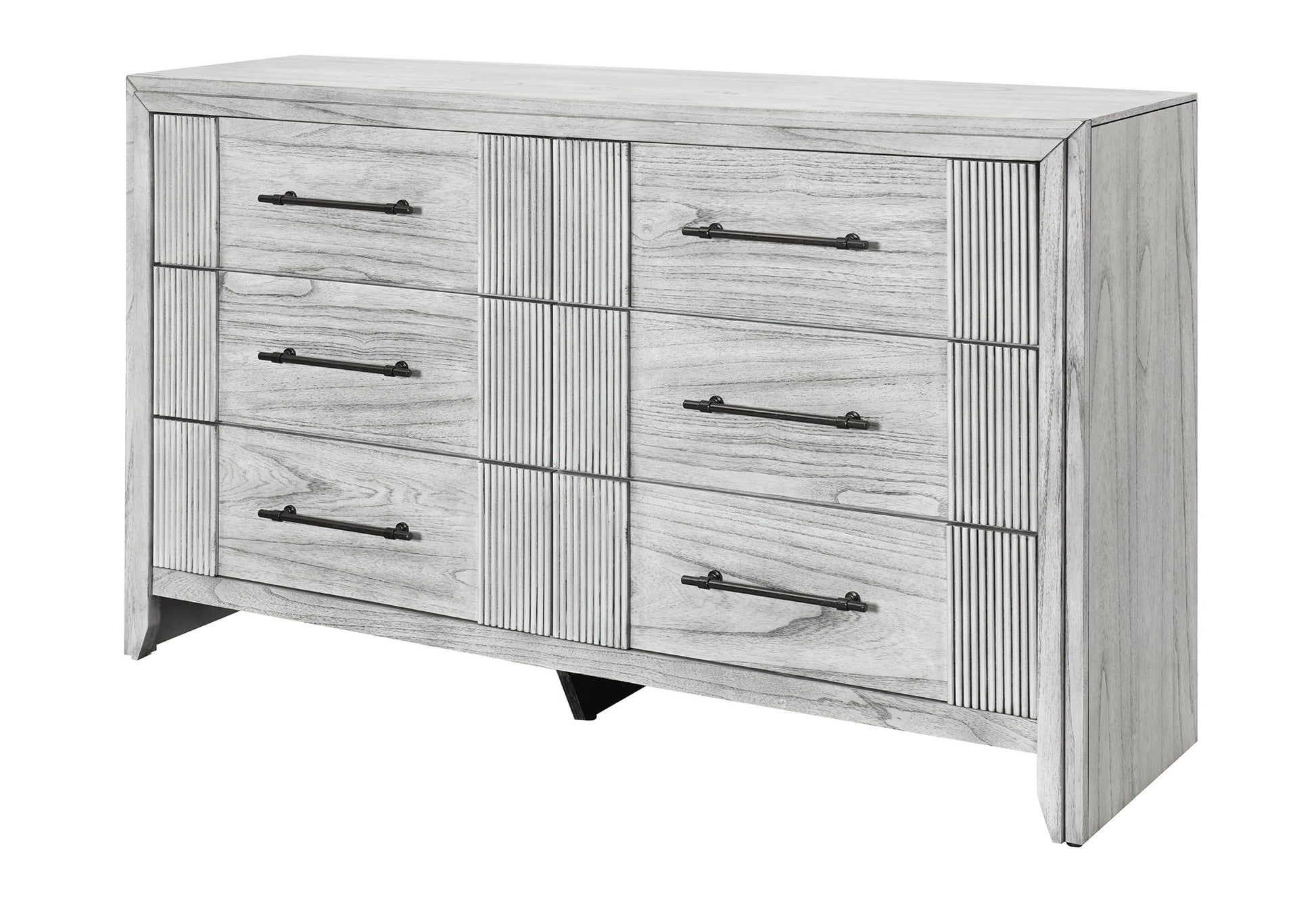 The Elsie Dresser offers both beauty and functionality. Finished in a chic grey wash veneer, it features partially fluted drawer fronts for a touch of modern texture. Dark hardware adds bold contrast, while spacious drawers provide ample storage for clothing and essentials. This dresser pairs seamlessly with the entire Elsie collection while offering everyday convenience.
