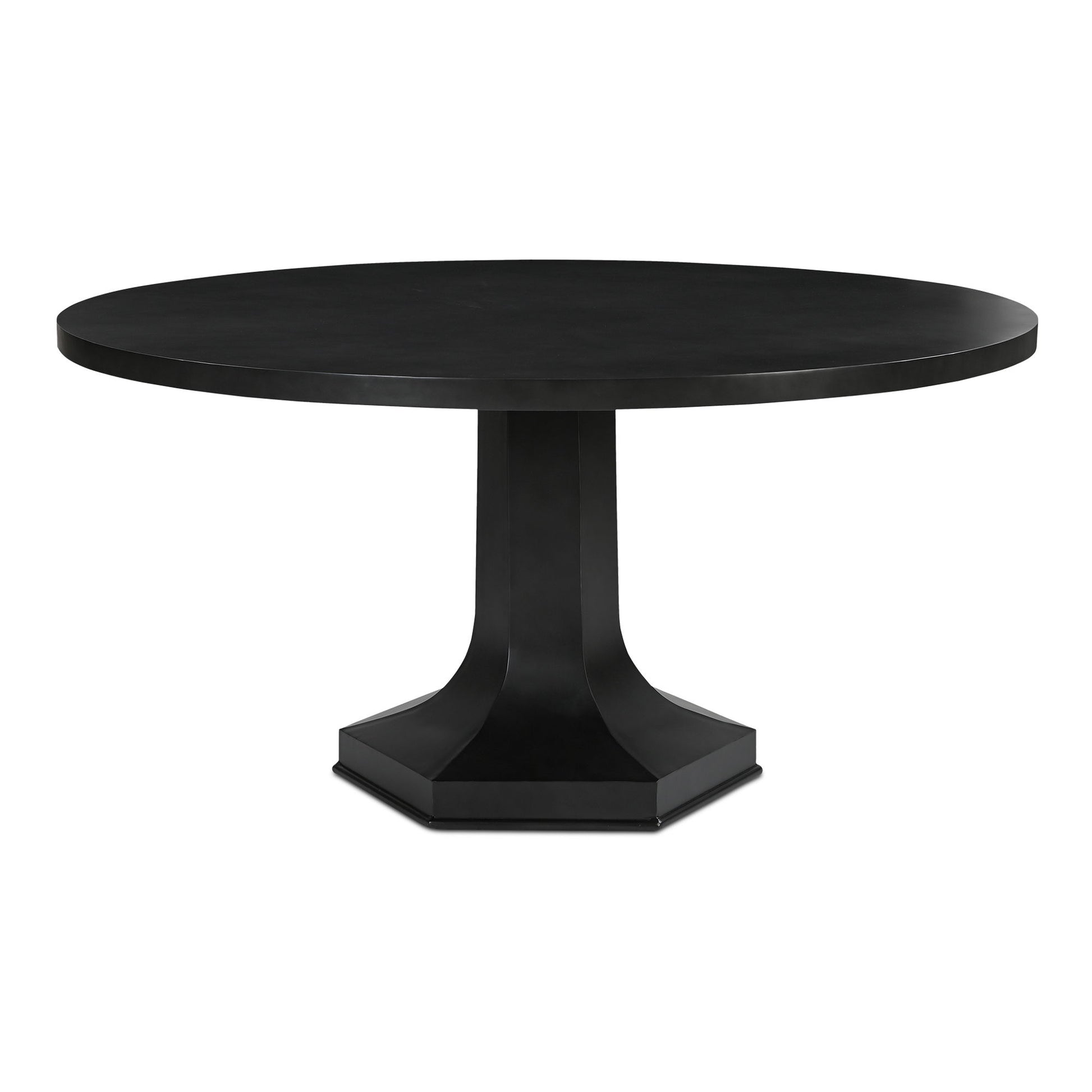 • Thick tabletop with a geometric base where each hexagon side curves down to soften the geometric shape