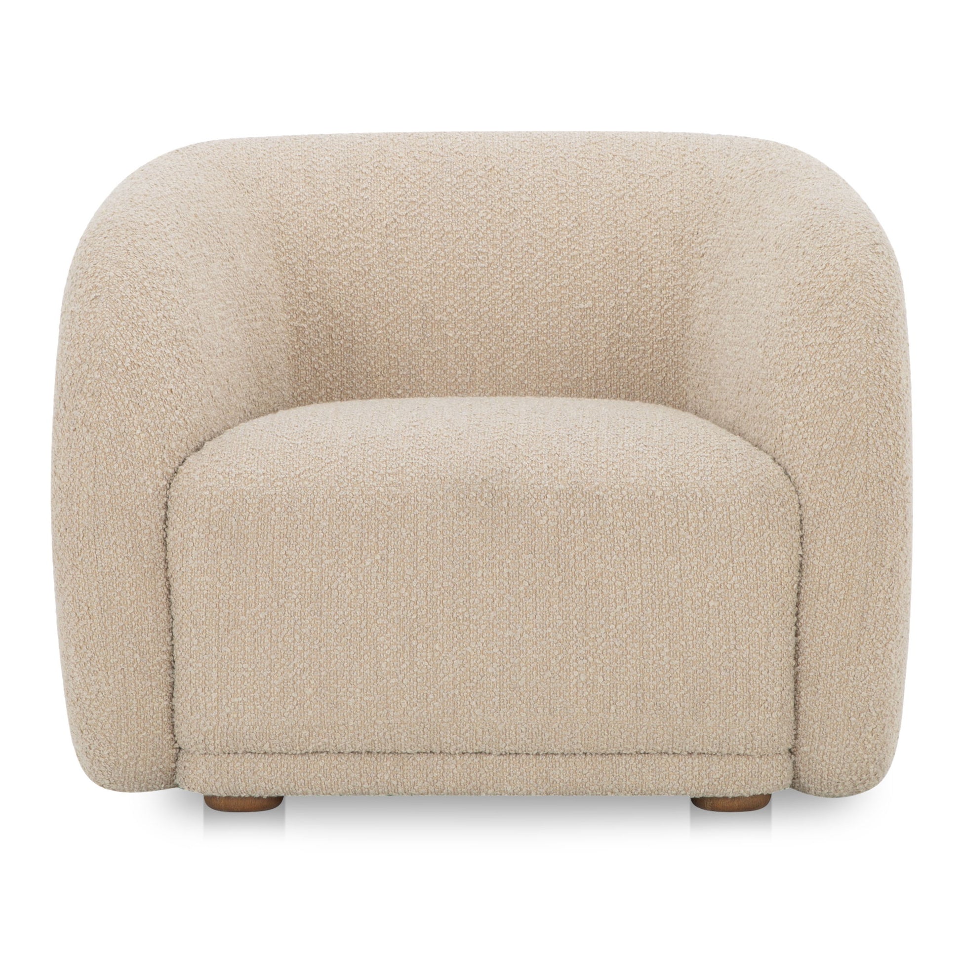 Constructed from solid beech and plywood, the Faye accent chair's unique curved back and firm, fixed bench seat rest on petite, rounded rubberwood legs. The exaggerated boucle fabric with a robust 100,000 rub count brings depth and an art deco feel to its contemporary form--a touch of elegance to expansive living.