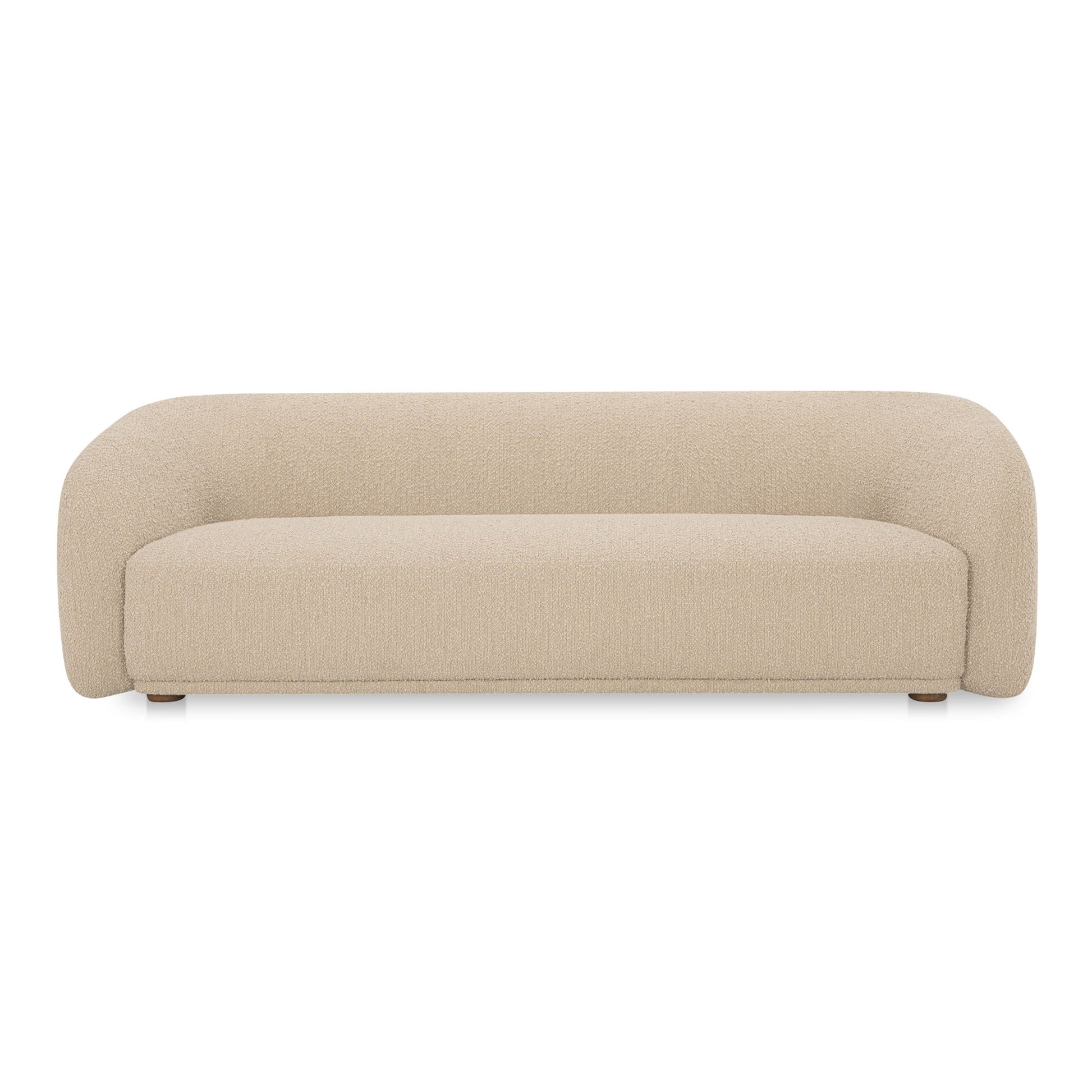 Constructed from solid beech and plywood, the Faye sofa's unique curved back and firm, fixed bench seat rest on petite, rounded rubberwood legs. The exaggerated boucle fabric has a robust 100,000 rub count bringing depth and an art deco feel to its contemporary form--a touch of elegance to expansive living.