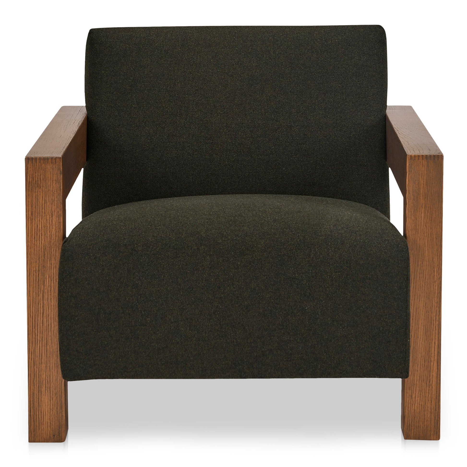 Crafted with a solid oak frame and detailed in a warm, aged stain highlighting its expressive grain, the Garnet lounge chair showcases a soft wool blend upholstery for a touch of heritage feel. Its blocky form blends traditional and retro aesthetics, creating a warm, inviting piece that complements any setting.