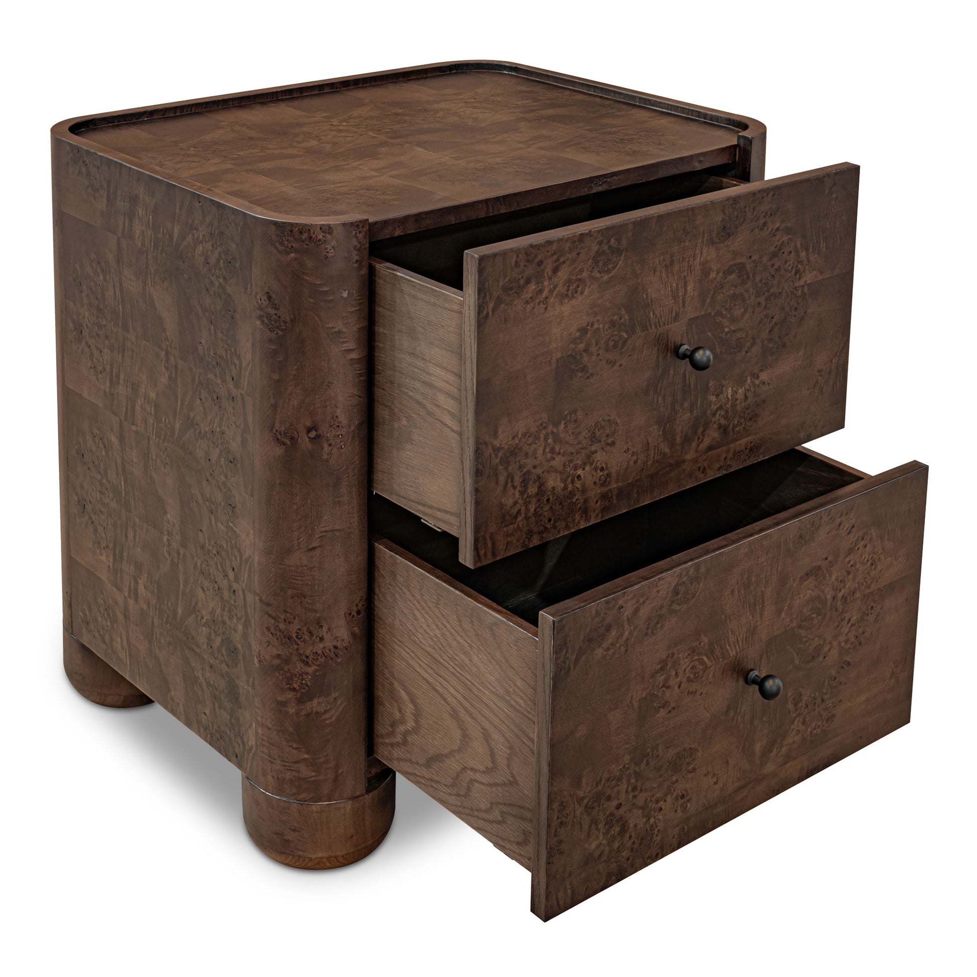 • Solid oak leg, front, & frame. burl veneer over MDF drawer box