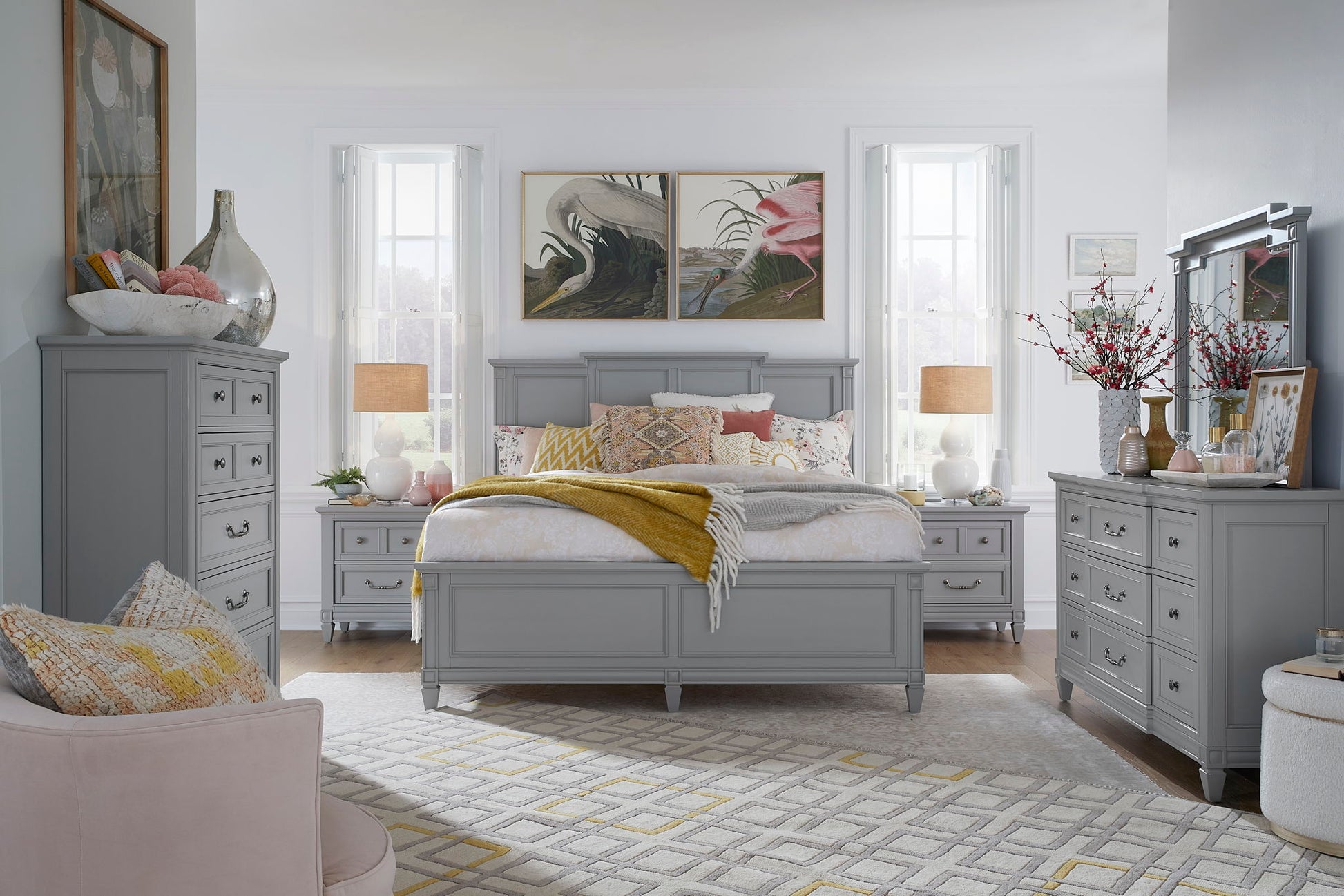 With casual traditional roots, the Glenbrook bedroom collection offers an array of inspiring design details. Its timeless silhouettes and classical design elements feel familiar yet refreshed and are sure to enhance any bedroom. A soft, easygoing Pebble finish brings to life its Birch veneers and hardwood solids while complementing any decor scheme. These classic designs feature panel detailing and metal hardware in Tarnished Silver that lends a touch of sparkle and reflectivity to the room. Storage pieces merge function and fashion to ensure there's a place for everything and everything has its place. Creating a beautifully functional bedroom has never been easier than with the smart styling of these Glenbrook furnishings