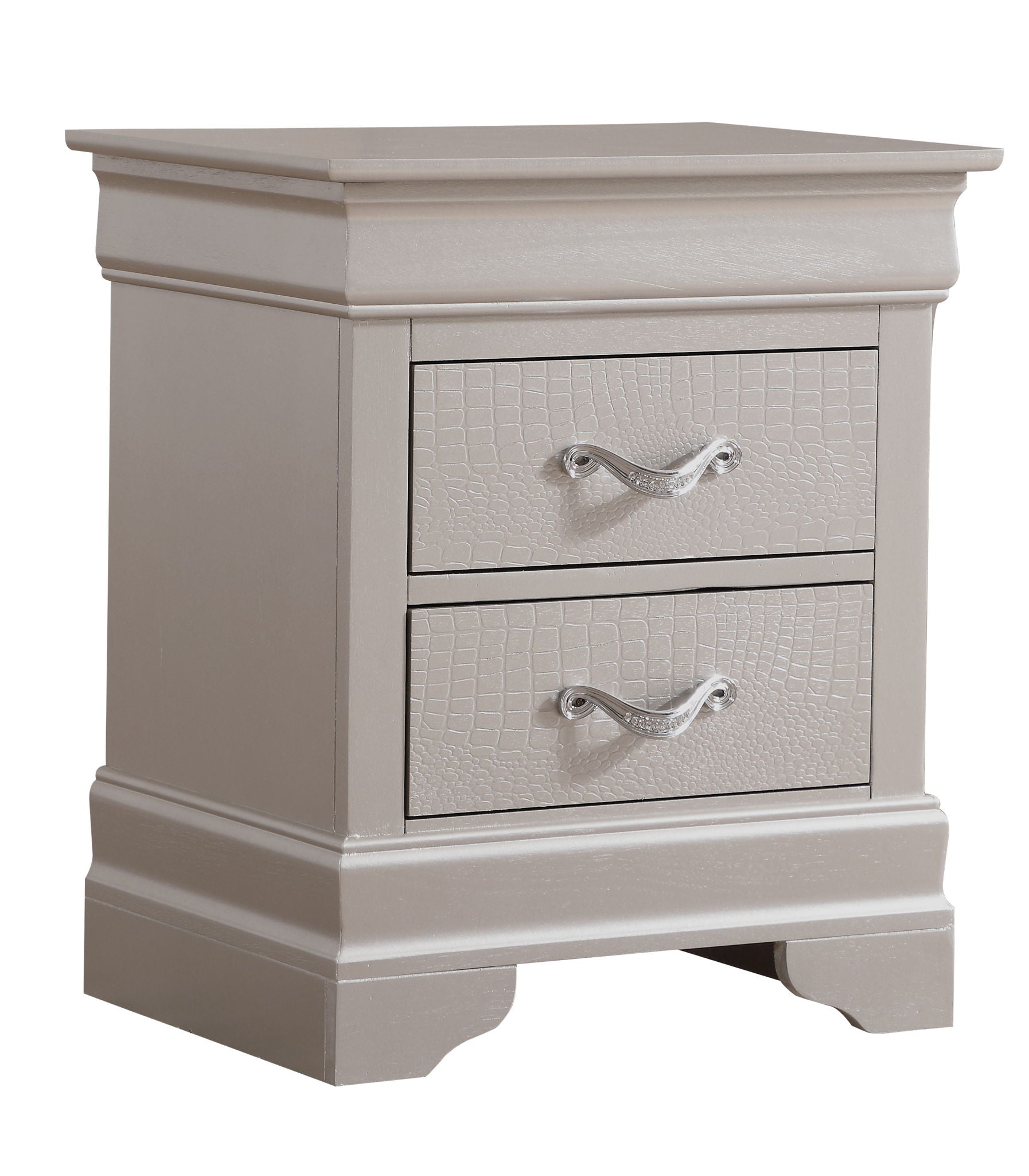 This nightstand combines functionality and contemporary design effortlessly. It features chrome pulls adorned with decorative faux crystals, enhancing the modern flair of any bedroom. The croc-textured finish on the drawer fronts provides a unique tactile appeal while maintaining a sophisticated look. With dimensions of 24"H x 21"W x 16"D, this nightstand is ideally suited for compact spaces, offering ample storage for your nighttime essentials. The drawers are designed with English dovetail construction for smooth and reliable operation, ensuring everything is easily accessible. Constructed with wood veneer and a sturdy framework, this nightstand promises reliability over time. This piece serves not only as a functional storage solution but also as an eye-catching addition to enhance your space.