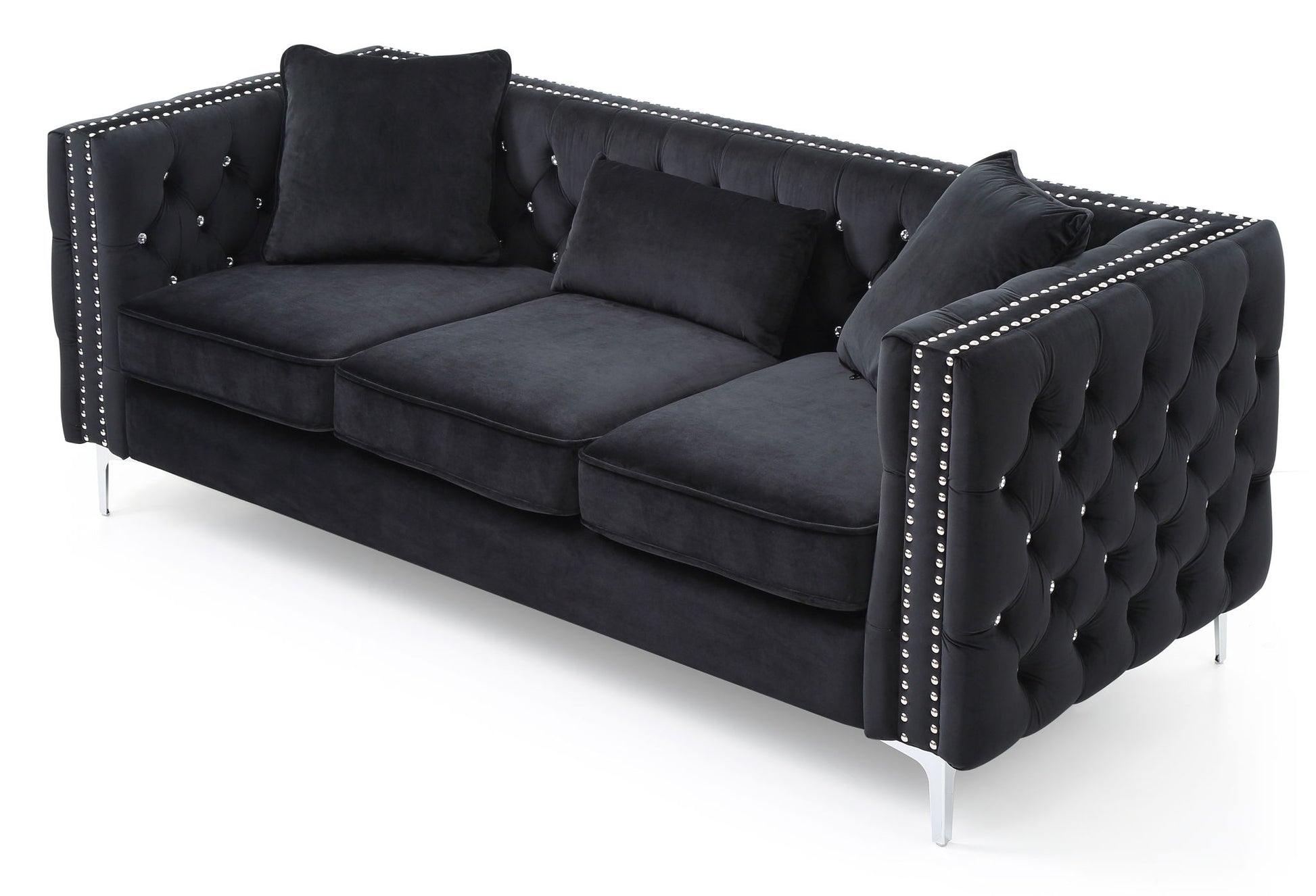 The sofa offers an exceptional blend of style and practicality, making it a perfect addition to any modern living area. Designed with an inviting tufted appearance and adorned with faux diamond buttons, it captures attention while providing a cozy seating experience. Made from high-quality velvet, this piece guarantees durability and comfort over time without compromising its visual appeal. The overall dimensions of 30"H x 86"W x 34"D make it an ideal choice for various room sizes, allowing you to maximize your space efficiently. Not only does it serve as a comfy seating arrangement for family gatherings, but it also creates an inviting atmosphere for entertaining guests. The KD design ensures that it arrives conveniently in a compact parcel, making transportation and setup a breeze. Whether placed in a cozy den or a spacious living room, this black sofa serves as a stylish focal point while adding functional value to your home.
