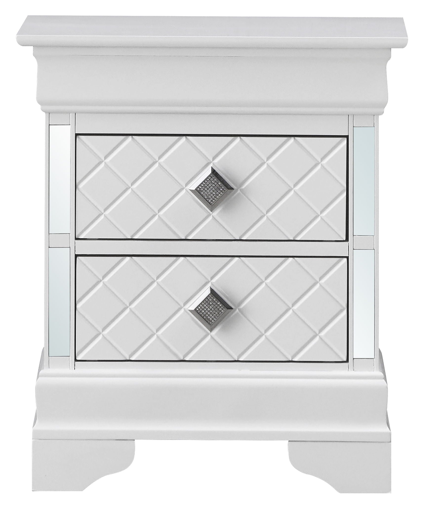 Discover the combination of functionality and aesthetics with this nightstand. Dressed in a stunning Metallic finish, it brings a contemporary flair to your bedroom while offering essential storage solutions. The eye-catching chrome pulls, embellished with faux crystals, not only enhance the visual appeal but also provide ease of access to the drawers. With overall dimensions of 24 inches high, 21 inches wide, and 16 inches deep, this nightstand fits seamlessly into various spaces, making it an ideal selection for compact areas. It features two spacious drawers, crafted with English dovetail construction for enhanced durability, serving your storage needs efficiently. Designed with user-friendly features, the unit incorporates wood veneer along with a robust frame, ensuring it stands the test of time. Metal center guides with a positive stop provide smooth drawer operation, allowing for easy access and secure storage of your items.