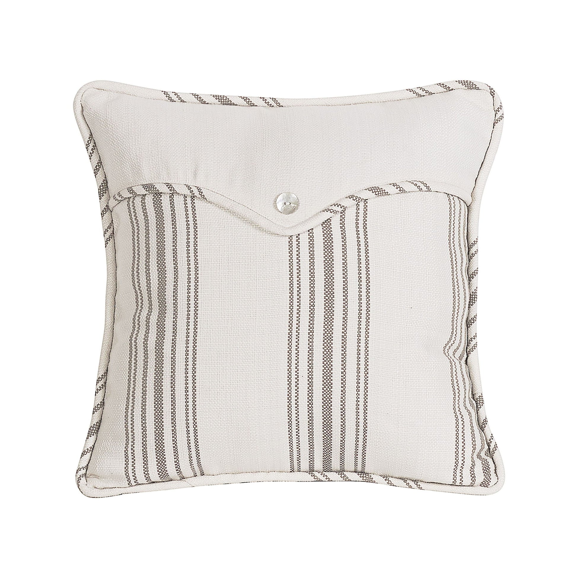 With its crisp white linen construction and the classic ticking stripe in taupe, this Gramercy accent pillow adds a casual yet sophisticated note to your bedroom. This pillow is decorated with an enveloped accent and a mother-of-pearl button in the center and finished with refined piped edges. Complement with our Gramercy Comforter Set and coordinating Gramercy pillows and shams to complete a classic and elegant bedroom ensemble. What's Included 1 Pillow Dimensions 18"W x 18"L Materials Shell: 100% polyester; Fill: 100% polyester Care Dry clean recommended. Hidden zipper closure.