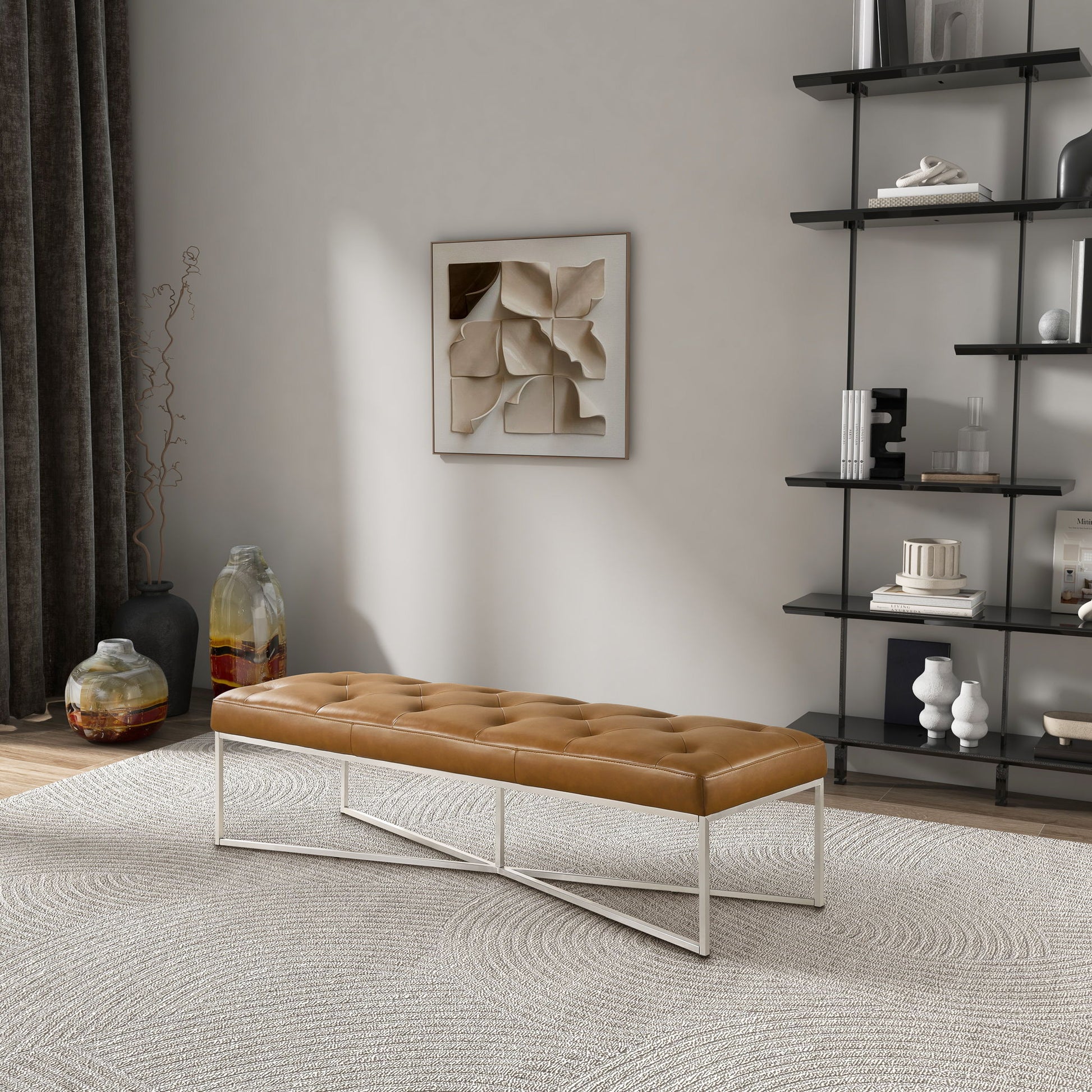 • Premium Upholstery: The Harper Tan Leather Bench is upholstered in full grain leather with buttons, offering a luxurious and sophisticated appearance.