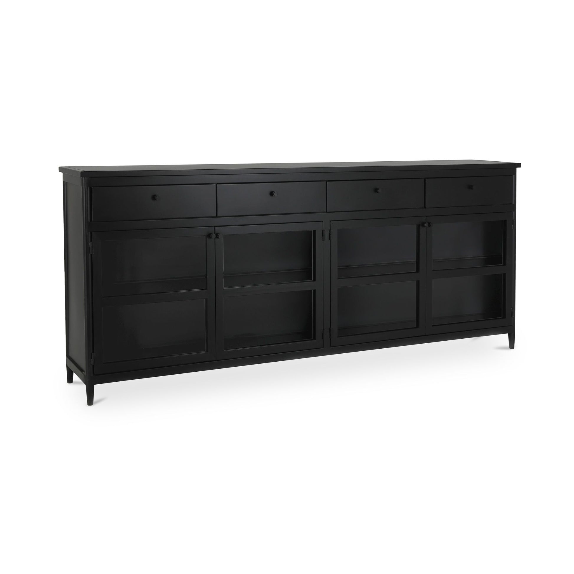 Built differently. The case for going full metal. Henry brings something different to the mix—full metal construction with a clean, transitional frame that adds texture and polish to any space. Four doors, half-glass and half-solid, offer a sleek way to show off what you love and stash what you don’t. Four doors, four drawers, and four shelves keep things tidy. Finished in matte black powder-coated steel, it’s a storage piece that keeps its cool—on display and behind the scenes.