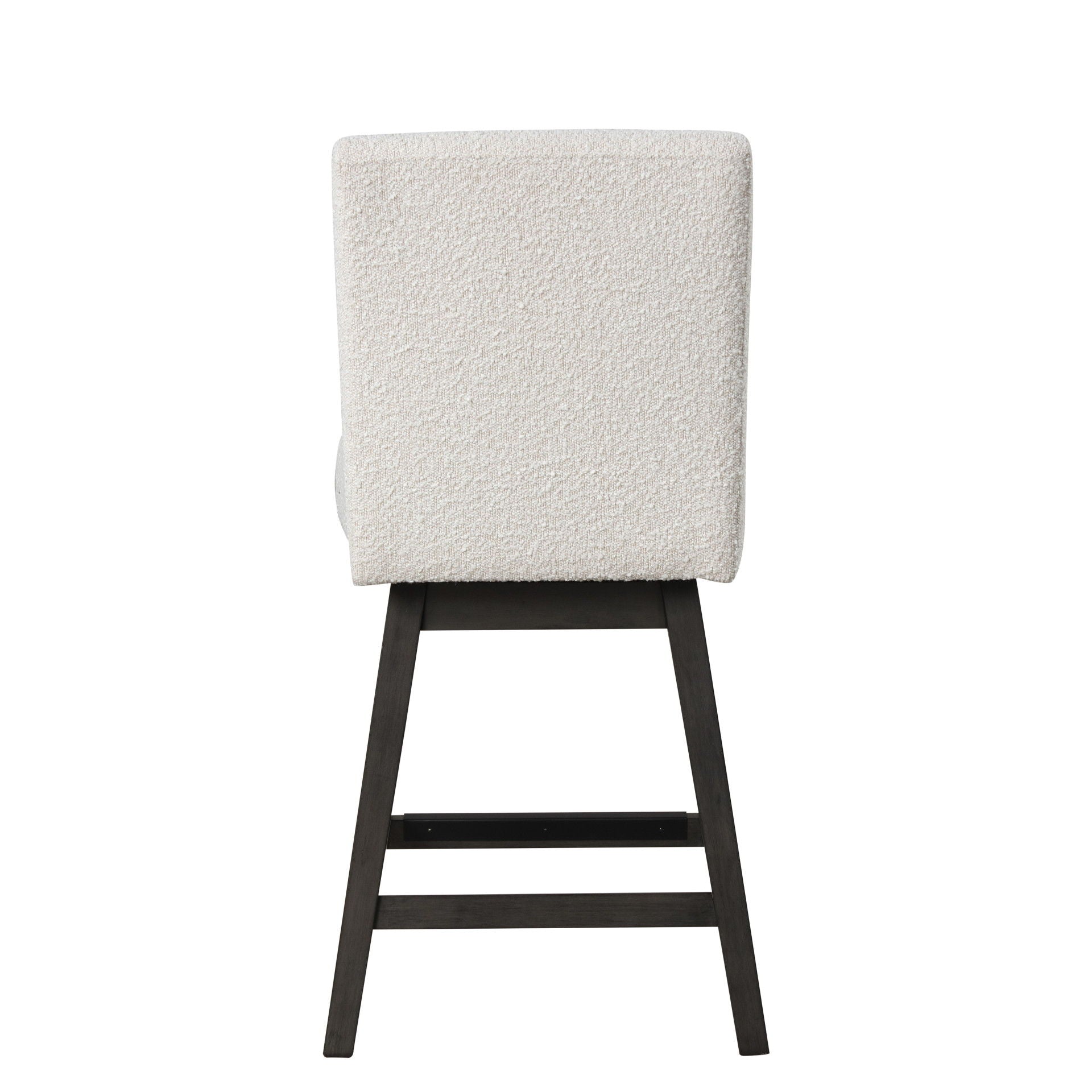 The High Line Counter Height Swivel Chairs offer a blend of durability, comfort, and functionality. Each set includes two counter swivel stools, expertly crafted from solid Acacia and Rubberwood, complemented by high-quality manufactured woods and Birch veneers to ensure long-lasting durability and stability. These chairs are upholstered in luxurious bouclé fabric, known for its exceptional durability, making them ideal for frequent use. The unique looped texture provides a plush, comfortable seating experience, adding both elegance and longevity to your dining area. The side-to-side 180° swivel feature allows for easy conversation, making these chairs perfect for dining rooms, kitchen islands, bars, or as accent chairs. They add both functionality and aesthetic appeal to any space. The High Line Counter Height Swivel Chairs are a versatile and stylish addition to any home, combining practical features with a touch of sophistication.