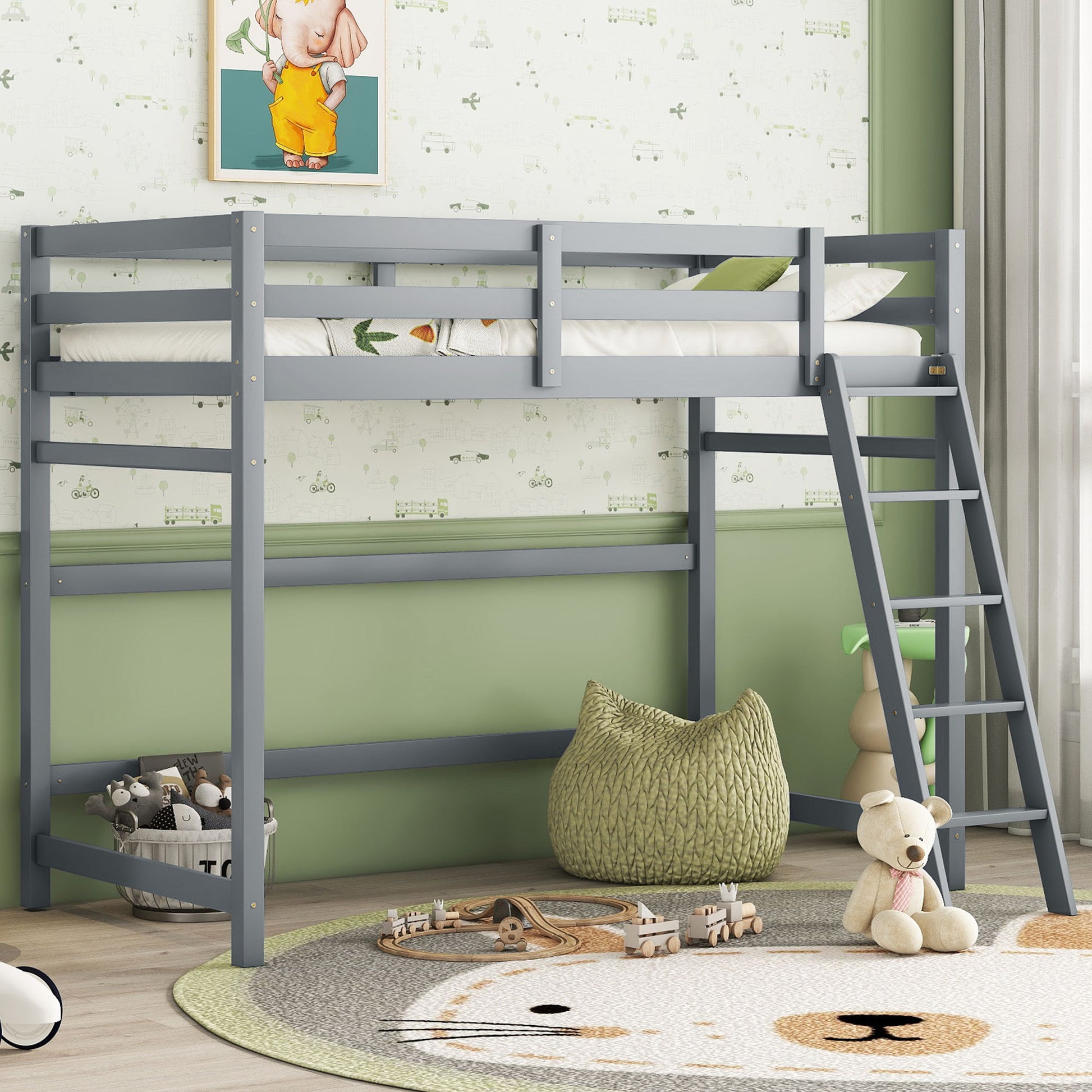 High Loft Bed With Inclined Ladder, Guardrails