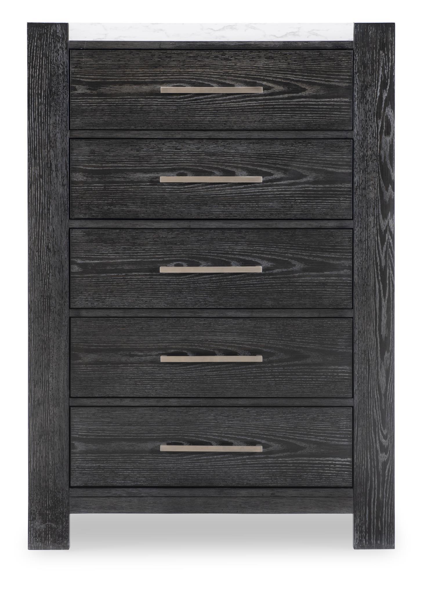 Casual elegance meets refined detail with the 5031 Horizons bedroom. The rich Espresso finish highlights the transitional appeal of oak veneer and select hardwood solids,, while modern design elements lend a fresh,, elevated touch to the bedroom. Marble laminate tops on the cases provide a cool contrast to the deep wood tones. Brushed nickel hardware pops against the dark finish. The panel headboard and dresser mirror feature marble laminate accents,, adding visual interest and tying into the case design. Designed with thoughtful craftsmanship,, drawers are built with French dovetail construction and ball bearing metal side glides,, offering smooth,, quiet function and quality. The bed is offered in twin,, full,, queen and king sizes.